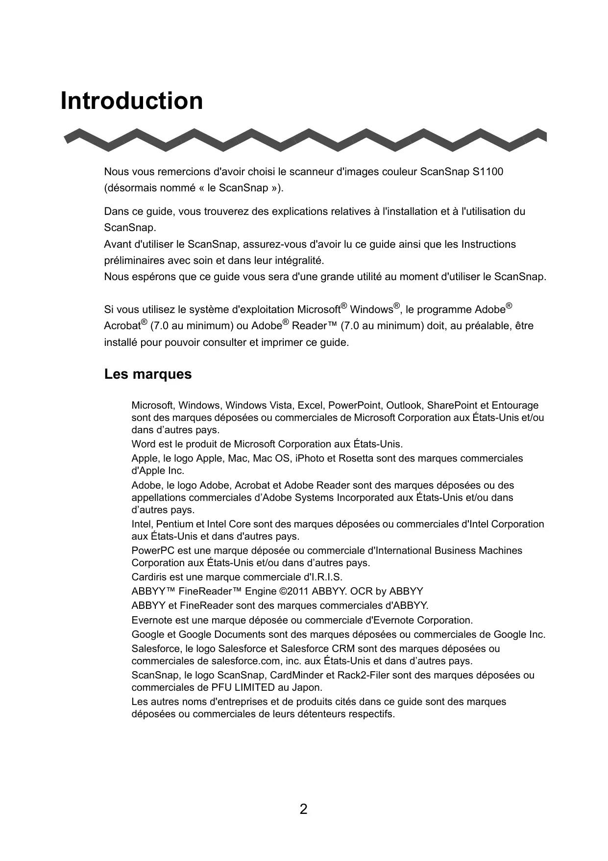 Les marques Microsoft, Windows, Windows Vista, Excel, PowerPoint, Outlook, SharePoint et Entourage sont des marques déposées ou commerciales de Microsoft Corporation aux États-Unis et/ou dans d’autres pays. Word est le produit de Microsoft Corporation aux États-Unis. Apple, le logo Apple, Mac, Mac OS, iPhoto et Rosetta sont des marques commerciales d'Apple Inc. Adobe, le logo Adobe, Acrobat et Adobe Reader sont des marques déposées ou des appellations commerciales d’Adobe Systems Incorporated aux États-Unis et/ou dans d’autres pays. Intel, Pentium et Intel Core sont des marques déposées ou commerciales d'Intel Corporation aux États-Unis et dans d'autres pays. PowerPC est une marque déposée ou commerciale d'International Business Machines Corporation aux États-Unis et/ou dans d’autres pays. Cardiris est une marque commerciale d'I.R.I.S. ABBYY™ FineReader™ Engine ©2011 ABBYY. OCR by ABBYY ABBYY et FineReader sont des marques commerciales d'ABBYY. Evernote est une marque déposée ou commerciale d'Evernote Corporation. Google et Google Documents sont des marques déposées ou commerciales de Google Inc. Salesforce, le logo Salesforce et Salesforce CRM sont des marques déposées ou commerciales de salesforce.com, inc. aux États-Unis et dans d’autres pays. ScanSnap, le logo ScanSnap, CardMinder et Rack2-Filer sont des marques déposées ou commerciales de PFU LIMITED au Japon. Les autres noms d'entreprises et de produits cités dans ce guide sont des marques déposées ou commerciales de leurs détenteurs respectifs.