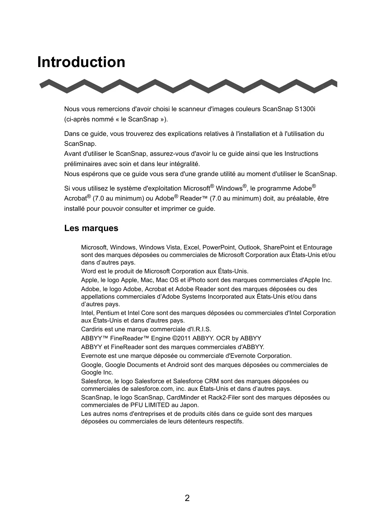 Les marques Microsoft, Windows, Windows Vista, Excel, PowerPoint, Outlook, SharePoint et Entourage sont des marques déposées ou commerciales de Microsoft Corporation aux États-Unis et/ou dans d’autres pays. Word est le produit de Microsoft Corporation aux États-Unis. Apple, le logo Apple, Mac, Mac OS et iPhoto sont des marques commerciales d'Apple Inc. Adobe, le logo Adobe, Acrobat et Adobe Reader sont des marques déposées ou des appellations commerciales d’Adobe Systems Incorporated aux États-Unis et/ou dans d’autres pays. Intel, Pentium et Intel Core sont des marques déposées ou commerciales d'Intel Corporation aux États-Unis et dans d'autres pays. Cardiris est une marque commerciale d'I.R.I.S. ABBYY™ FineReader™ Engine ©2011 ABBYY. OCR by ABBYY ABBYY et FineReader sont des marques commerciales d'ABBYY. Evernote est une marque déposée ou commerciale d'Evernote Corporation. Google, Google Documents et Android sont des marques déposées ou commerciales de Google Inc. Salesforce, le logo Salesforce et Salesforce CRM sont des marques déposées ou commerciales de salesforce.com, inc. aux États-Unis et dans d’autres pays. ScanSnap, le logo ScanSnap, CardMinder et Rack2-Filer sont des marques déposées ou commerciales de PFU LIMITED au Japon. Les autres noms d'entreprises et de produits cités dans ce guide sont des marques déposées ou commerciales de leurs détenteurs respectifs.