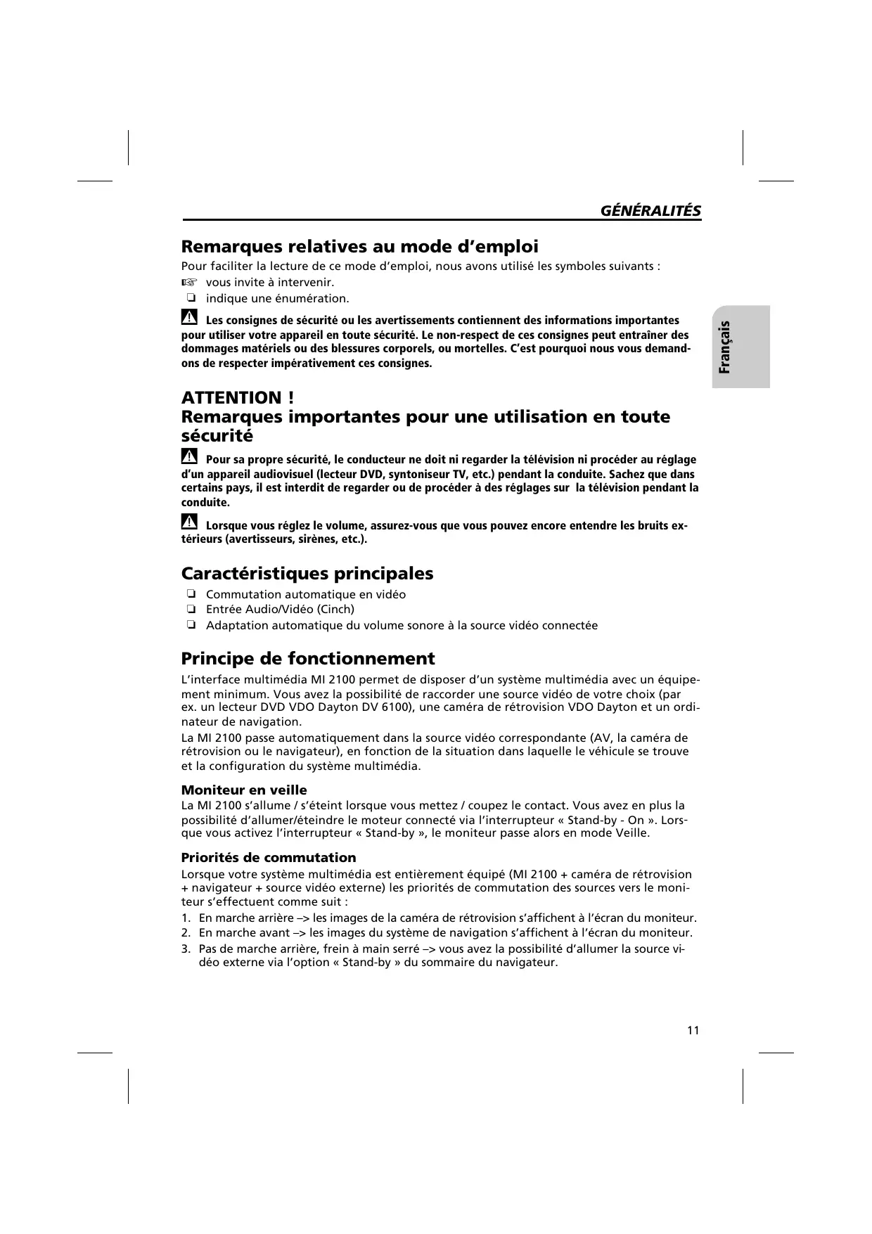 Lorsque votre système multimédia est entièrement équipé (MI 2100 +amera de rétrovision + navigateur + source video externe) les priorités de commutation des sources vers le monisteur s'effectuent comme suit :