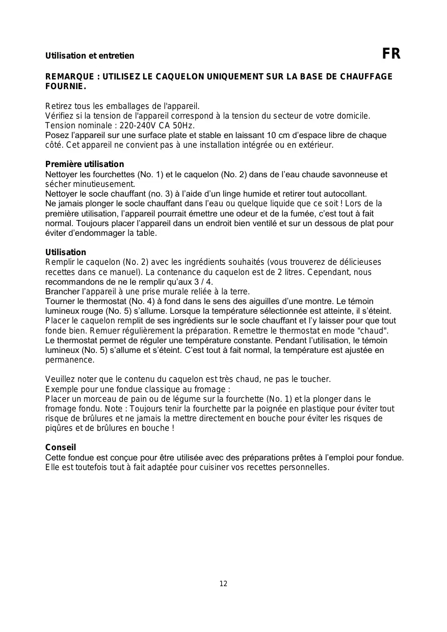 Remplir le caquelon (No. 2) avec les ingrédents souhaités (vous trouvrez de délicieuses recettes dans ce manuel). La contentance du caquelon est de 2 litres. Cependant, nous recommendons de ne le replir qu'aux 3 / 4.