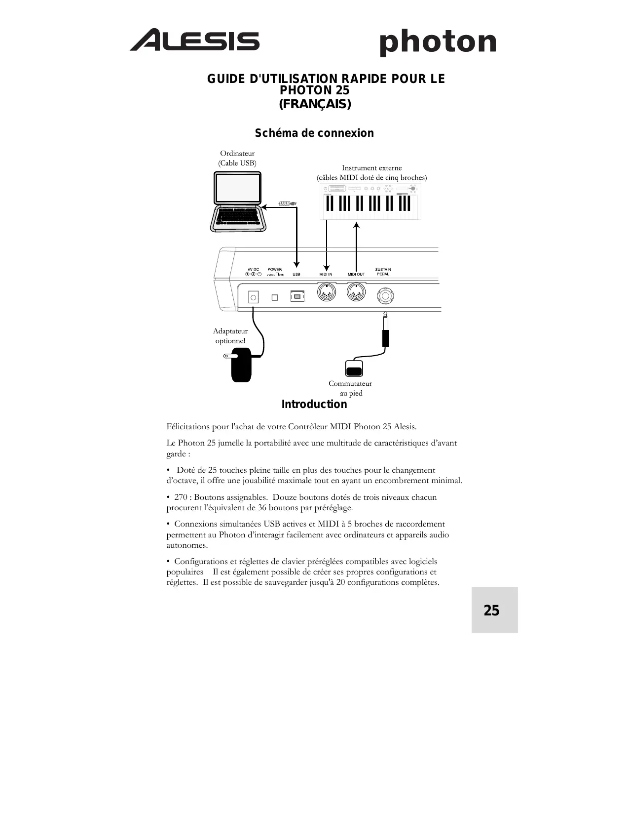 Felicitations pour l'achat de votre Contrôleur MIDI Photon 25 Alesis.