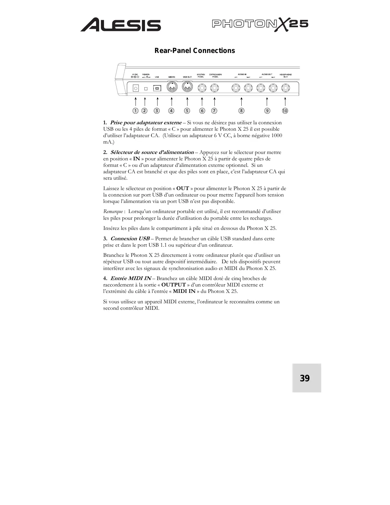 Felicitations pour l'achat de votre Contrôleur MIDI Photon X 25 avec interface audio stéreo de 24 bits Alesis. Le Photon X 25 jumelle la portabilité avec une multitude de caractéristiques d'avant-garde: