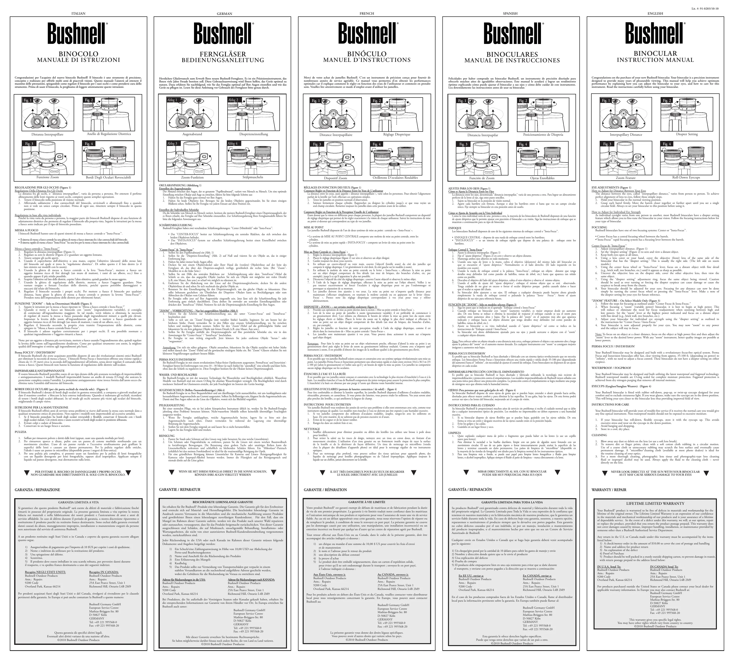 liquides de nettoyage pour lentilles photographiques ou de l'alcool isopropylique. Appliquez toujours le liquide sur un chiffon, jamais directement sur la lentille. Wenn Sie mit Ihrem Fernglas direkt in die Sonne schauen, können Ihre Augen verletzt werden Il est très dangereux pour les yeux de regarder le soleil directement avec les jumelles GARANTIE / REPARATUR GARANZIA / REPARAZIONE Recapito In Canada: Bushnell Outdoor Products Attn.: Repairs 25A East Pearce Street, Unit 1 Richmond Hill, Ontario L4B 2M9 Per prodotti acquistati fuori degli Stati Uniti o del Canada, rivolgersi al rivenditore per le clausole pertinenti della garanzia. In Europa si può anche contattare la Bushnell a questo numero: Bushnell Germany GmbH European Service Centre Mathias-Brüggen-Str. 80 D-50827 Köln GERMANY Tel: +49 221 995568-0 Fax: +49 221 995568-20 Questa garanzia dà specifici diritti legali. Eventuali altri diritti variano da una nazione all’altra. ©2010 Bushnell Outdoor Products Jeder Rücksendung in die USA oder nach Kanada im Rahmen dieser Garantie müssen folgende Dokumente und Angaben beigefügt werden: