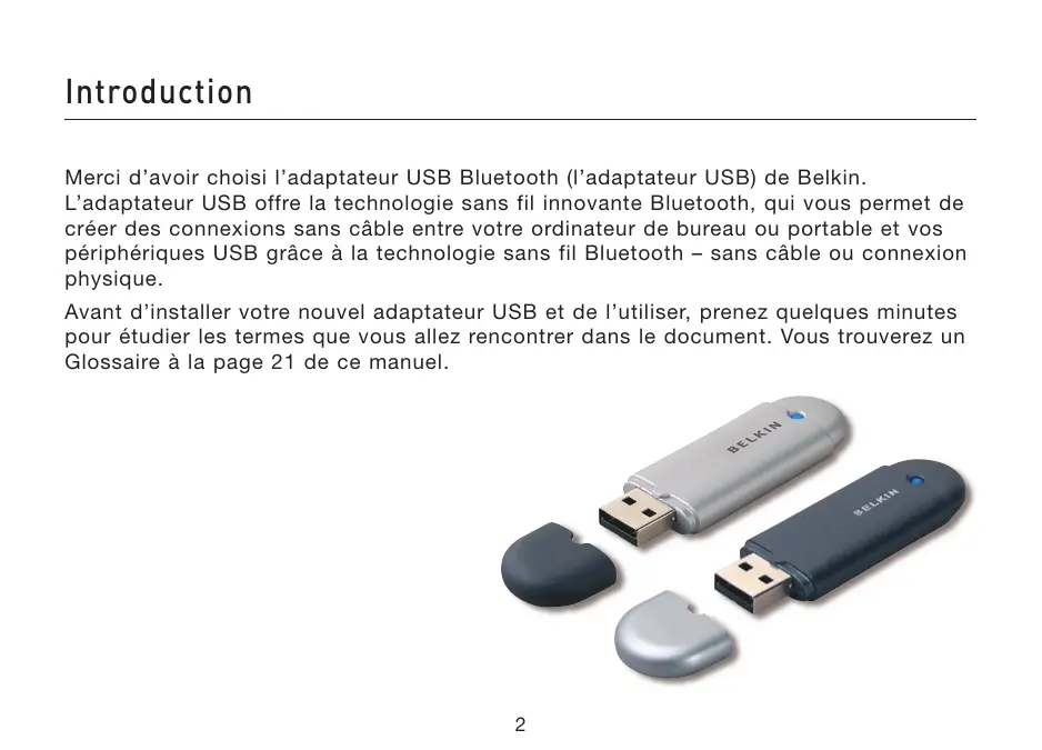Manuel de l’utilisateur F8T008 - F8T009 Introduction Merci d’avoir choisi l’adaptateur USB Bluetooth (l’adaptateur USB) de Belkin. L’adaptateur USB offre la technologie sans fil innovante Bluetooth, qui vous permet de créer des connexions sans câble entre votre ordinateur de bureau ou portable et vos périphériques USB grâce à la technologie sans fil Bluetooth – sans câble ou connexion physique. Avant d’installer votre nouvel adaptateur USB et de l’utiliser, prenez quelques minutes pour étudier les termes que vous allez rencontrer dans le document. Vous trouverez un Glossaire à la page 21 de ce manuel.