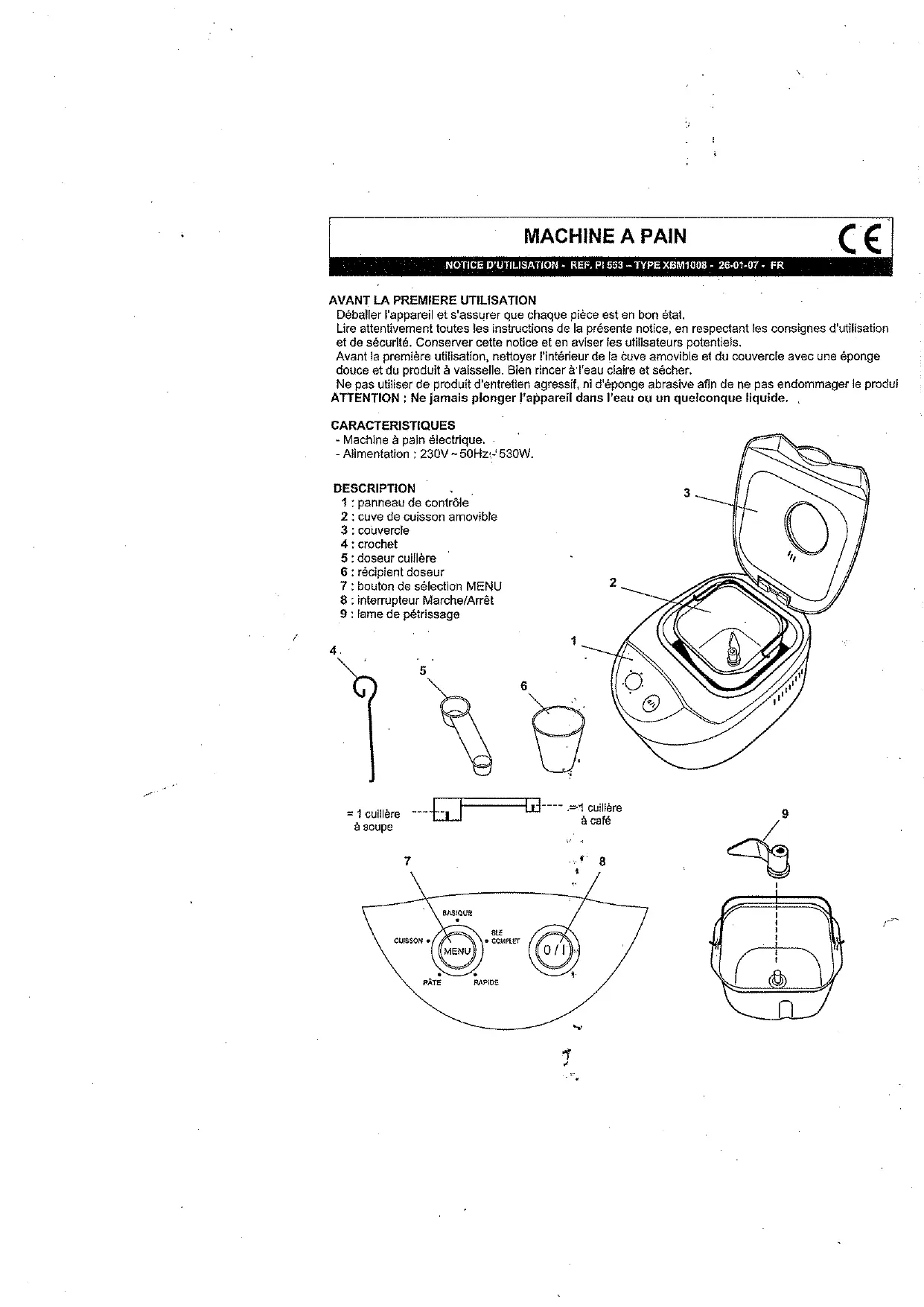 - Presser le bouton de selection MENU (7) pourCHOISIR I'un des cinq programmes : BASIQUE, BLE COMPLET, RAPIDE, PATE, CUISSON.