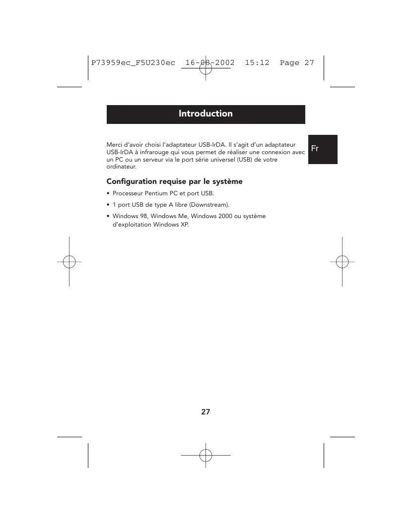 P73959ec_F5U230ec 16-08-2002 15:12 Page 27 Introduction Merci d’avoir choisi l’adaptateur USB-IrDA. Il s’agit d’un adaptateur USB-IrDA à infrarouge qui vous permet de réaliser une connexion avec un PC ou un serveur via le port série universel (USB) de votre ordinateur. Configuration requise par le système