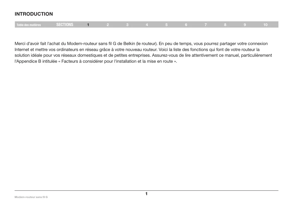 Merci d'avoir fait l'achat du Modem-routeur sans fil G de Belkin (le routeur). En peu de temps, vous pourrez partager votre connexion Internet et mettre vos ordinateurs en réseau grâce à votre nouveau routeur. Voici la liste des fonctions qui font de votre routeur la solution idéale pour vos réseaux domestiques et de petites entreprises. Assurez-vous de lire attentivement ce manuel, particulièrement l'Appendice B intitulée « Facteurs à considérer pour l'installation et la mise en route ». Modem-routeur sans fil G