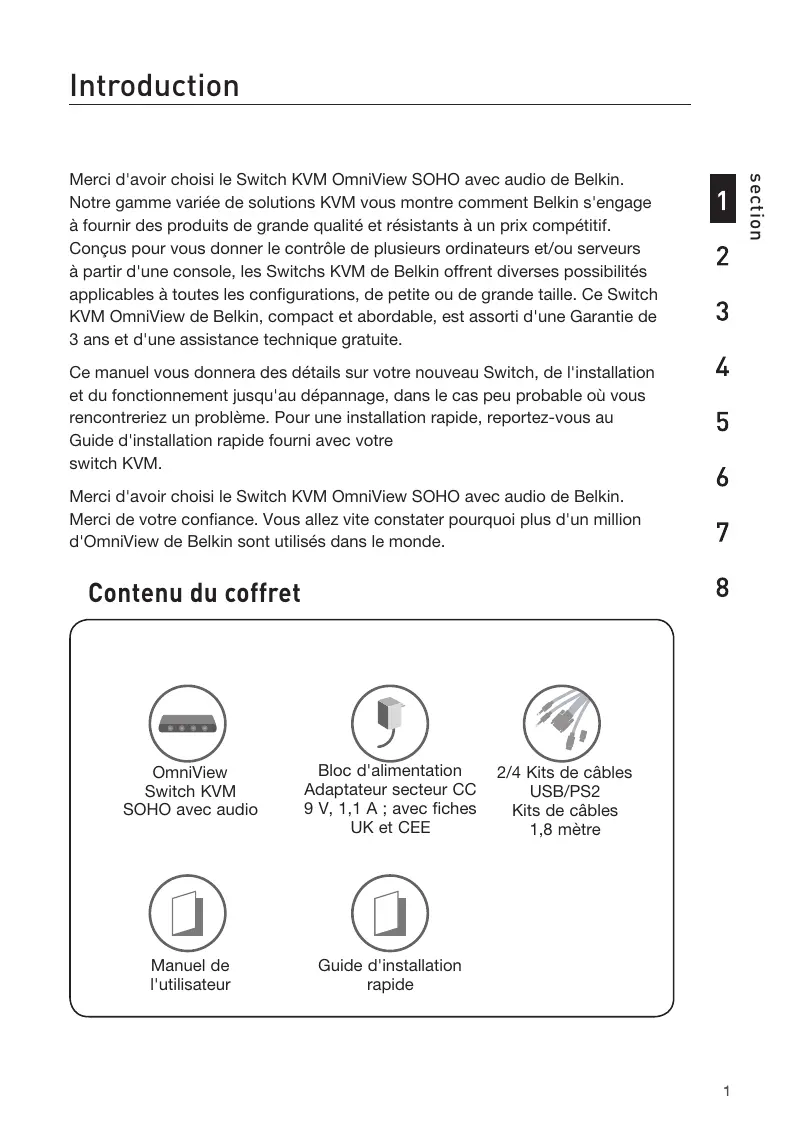 Introduction section Merci d'avoir choisi le Switch KVM OmniView SOHO avec audio de Belkin. Notre gamme variée de solutions KVM vous montre comment Belkin s'engage à fournir des produits de grande qualité et résistants à un prix compétitif. Conçus pour vous donner le contrôle de plusieurs ordinateurs et/ou serveurs à partir d'une console, les Switchs KVM de Belkin offrent diverses possibilités applicables à toutes les configurations, de petite ou de grande taille. Ce Switch KVM OmniView de Belkin, compact et abordable, est assorti d'une Garantie de 3 ans et d'une assistance technique gratuite. Ce manuel vous donnera des détails sur votre nouveau Switch, de l'installation et du fonctionnement jusqu'au dépannage, dans le cas peu probable où vous rencontreriez un problème. Pour une installation rapide, reportez-vous au Guide d'installation rapide fourni avec votre switch KVM. Merci d'avoir choisi le Switch KVM OmniView SOHO avec audio de Belkin. Merci de votre confiance. Vous allez vite constater pourquoi plus d'un million d'OmniView de Belkin sont utilisés dans le monde. Contenu du coffret OmniView Switch KVM SOHO avec audio Bloc d'alimentation Adaptateur secteur CC 9 V, 1,1 A ; avec fiches UK et CEE Manuel de l'utilisateur Guide d'installation rapide 2/4 Kits de câbles USB/PS2 Kits de câbles 1,8 mètre