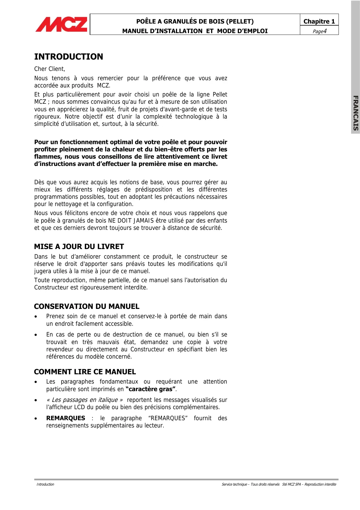 MANUEL D’INSTALLATION ET MODE D’EMPLOI Page4 INTRODUCTION Cher Client, Nous tenons à vous remercier pour la préférence que vous avez accordée aux produits MCZ. Pour un fonctionnement optimal de votre poêle et pour pouvoir profiter pleinement de la chaleur et du bien-être offerts par les flammes, nous vous conseillons de lire attentivement ce livret d’instructions avant d’effectuer la première mise en marche. Dès que vous aurez acquis les notions de base, vous pourrez gérer au mieux les différents réglages de prédisposition et les différentes programmations possibles, tout en adoptant les précautions nécessaires pour le nettoyage et la configuration. Nous vous félicitons encore de votre choix et nous vous rappelons que le poêle à granulés de bois NE DOIT JAMAIS être utilisé par des enfants et que ces derniers devront toujours se trouver à distance de sécurité.