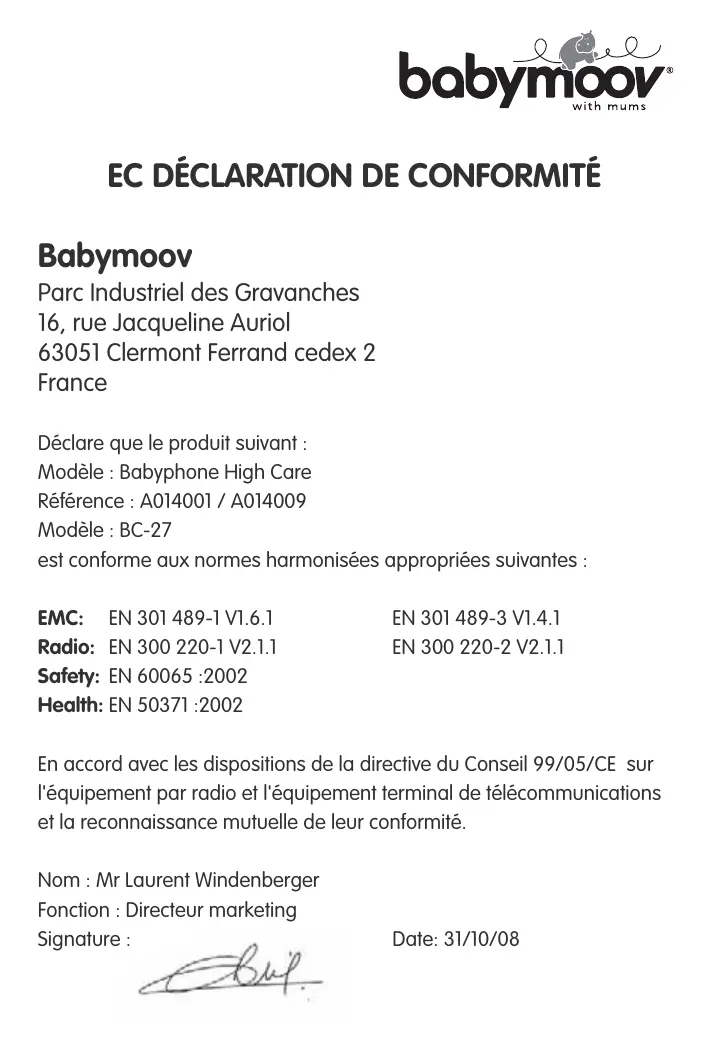 Babymoov Parc Industriel des Gravanches 16, rue Jacqueline Auriol 63051 Clermont Ferrand cedex 2 France Déclare que le produit suivant : Modèle : Babyphone High Care Référence : A014001 / A014009 Modèle : BC-27 est conforme aux normes harmonisées appropriées suivantes : EMC: EN 301 489-1 V1.6.1 Radio: EN 300 220-1 V2.1.1 Safety: EN 60065 :2002 Health: EN 50371 :2002