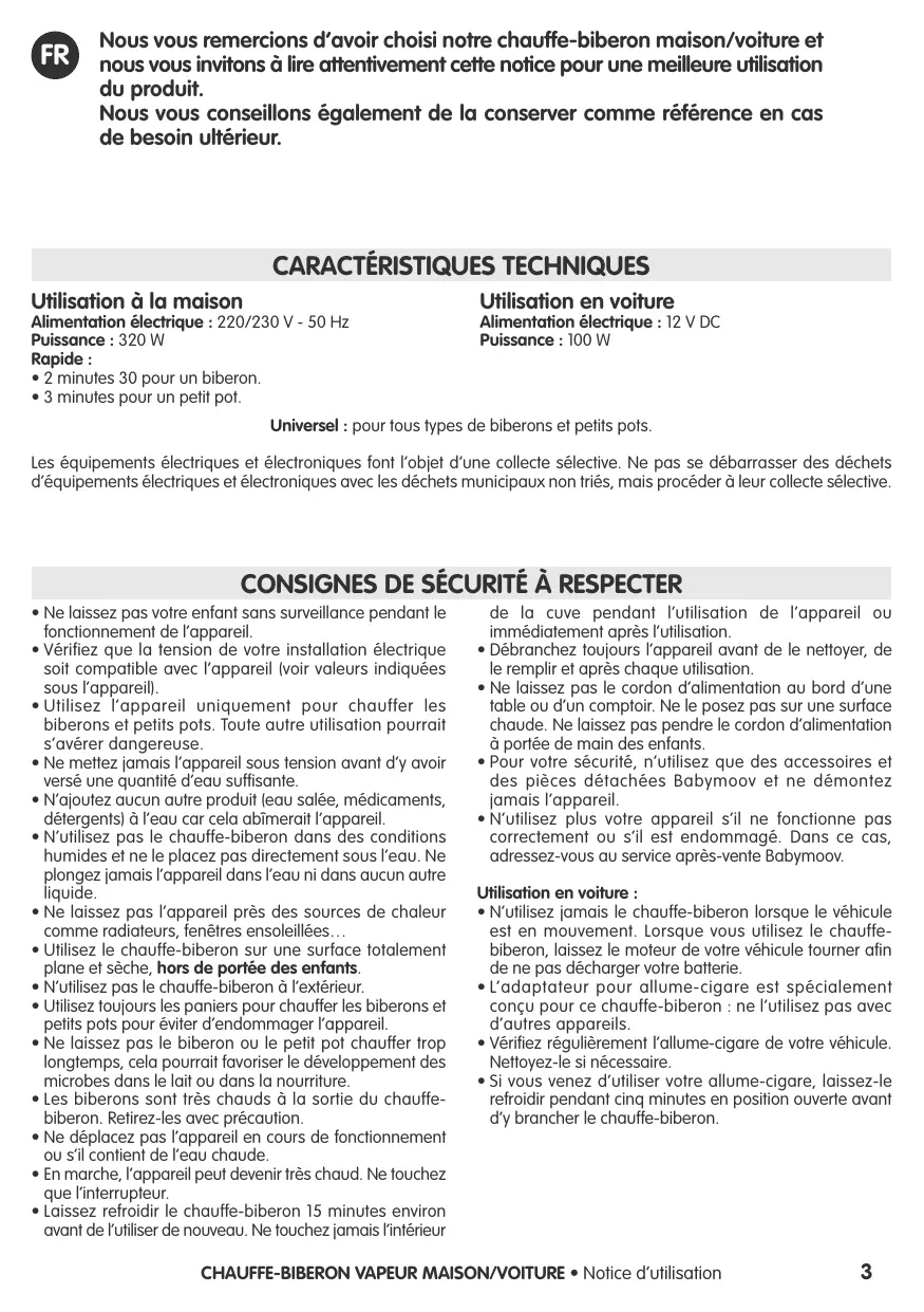 - 3 minutes pour un petit pot. Alimentation électrique : 12 V DC Puissance : 100 W Universel : pour tous types de biberons et petits pots. Les équipements électriques et électroniques font l’objet d’une collecte sélective. Ne pas se débarrasser des déchets d’équipements électriques et électroniques avec les déchets municipaux non triés, mais procéder à leur collecte sélective.
