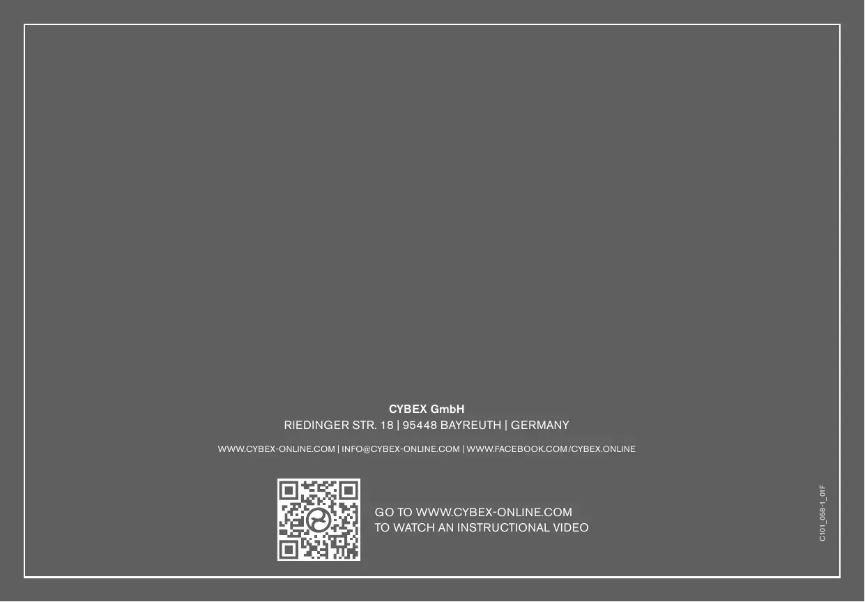 Au terme de sa durée de vie, le siège enfant doit être correctement éliminé. Le tri des déchets peut varier selon la localité où vous vous trouvez. Afin de vous assurer que le siège enfant est éliminé de façon appropriée, contactez le centre de traitement des déchets le plus proche ou la mairie de votre lieu de résidence. Dans tous les cas, respectez les réglementations nationales en vigueur en matière d΄élimination des déchets. Contact Cybex GmbH Riedinger Str. 18 / 95448 Bayreuth / Germany www.cybex-online.com / info@cybex-online.com www.facebook.com/cybex.online