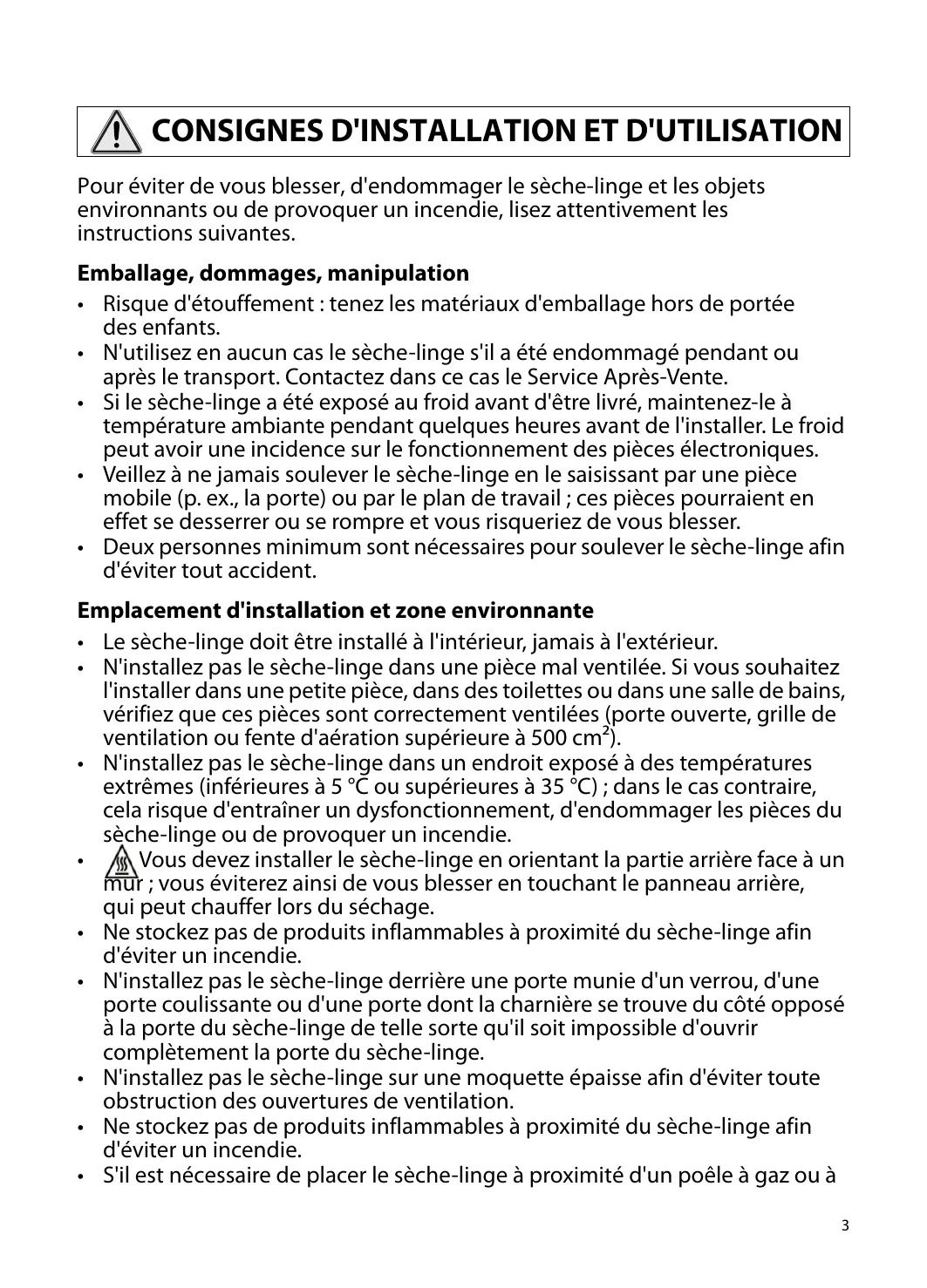 Pour éviter de vous blesser, d'endommager le sèche-linge et les objets environnants ou de provoquer un incendie, lisez attentivement les instructions suivantes. Emballage, dommages, manipulation