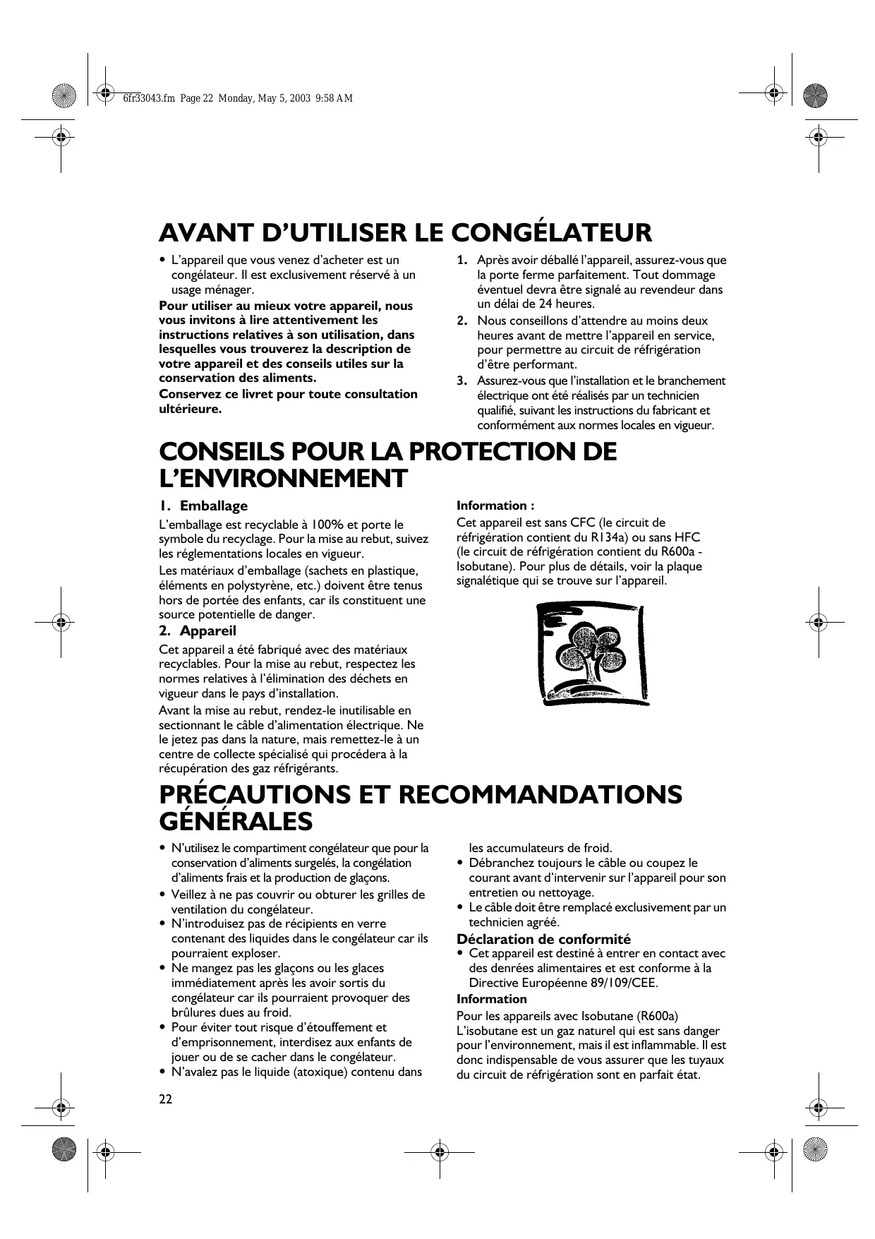 les accumulateurs de froid. Débranchez toujours le câble ou coupez le courant avant dintervenir sur lappareil pour son entretien ou nettoyage. Le câble doit être remplacé exclusivement par un technicien agréé. Déclaration de conformité Cet appareil est destiné à entrer en contact avec des denrées alimentaires et est conforme à la Directive Européenne 89/109/CEE. Information Pour les appareils avec Isobutane (R600a) Lisobutane est un gaz naturel qui est sans danger pour lenvironnement, mais il est inflammable. Il est donc indispensable de vous assurer que les tuyaux du circuit de réfrigération sont en parfait état. 6fr33043.fm Page 23 Monday, May 5, 2003 9:58 AM