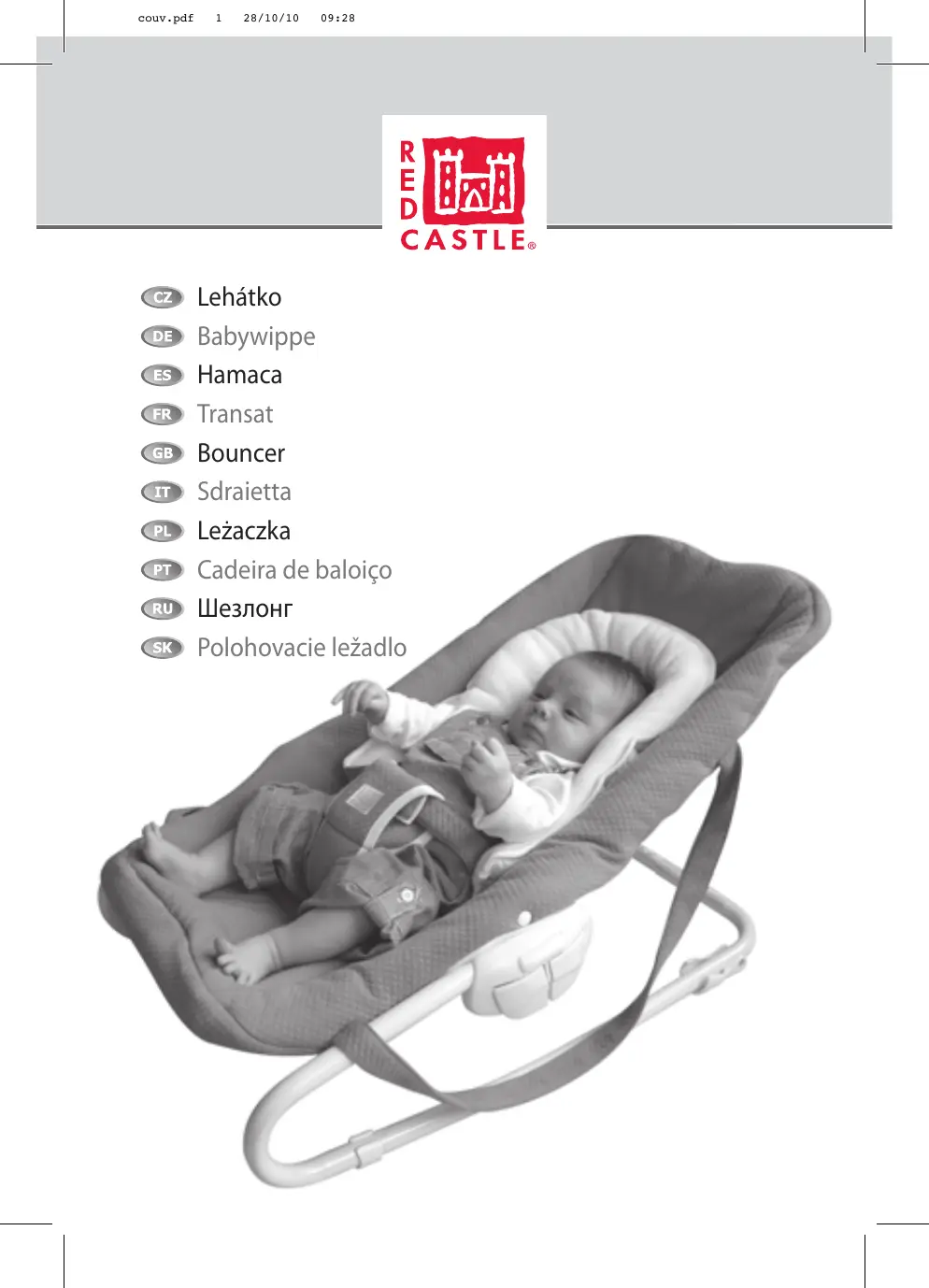 Le transat RED CASTLE est conforme à la norme EN 12790 : 2009 Ce transat est conçu pour un enfant dès la naissance à un poids maximal de 9 kg. Ce transat ne remplace pas un couffin ou un lit. Lorsque l’enfant a besoin de dormir, il convient de le placer dans un couffin ou un lit approprié. Ne pas utiliser le transat si des composants sont cassés ou manquants. Ne pas utiliser d’accessoires ou pièces de rechange autres que ceux approuvés par le fabricant. Attention aux risques induits par une flamme ou toute autre source de forte chaleur (par exemple, chauffages électriques, chauffages au gaz, cheminée, …). Eloigner l’enfant de toutes prises électriques, rallonges, etc.…ou objet pouvant être à la portée de l’enfant. Ce transat n’est pas un siège auto, ne JAMAIS l’utiliser pour transporter votre enfant en voiture. Contrôler régulièrement les vis et autres pièces plastiques. Attacher votre enfant dans le transat en toutes circonstances. Utiliser toujours l’entrejambe du système de retenue. ATTENTION ! Cesser de l’utiliser dès que votre enfant essaie de se hisser hors du transat. ATTENTION ! Afin d’éviter tout risque d’étranglement, NE PAS accrocher de ficelles, rubans ou cordelettes sur le transat ou sur votre enfant. Conforme aux exigences de sécurité.