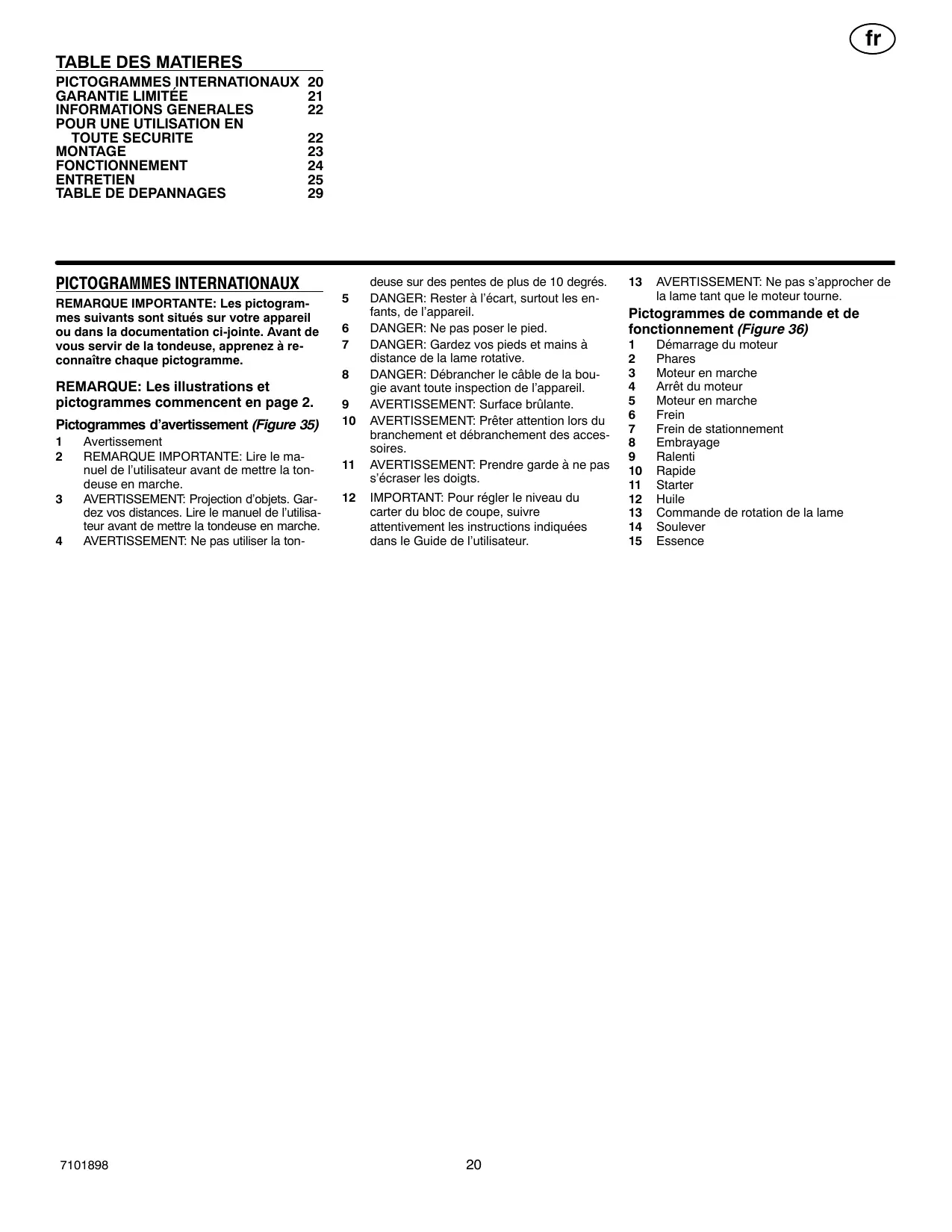 PICTOGRAMMES INTERNATIONAUX REMARQUE IMPORTANTE: Les pictogrammes suivants sont situés sur votre appareil ou dans la documentation ci-jointe. Avant de vous servir de la tondeuse, apprenez à reconnaître chaque pictogramme.