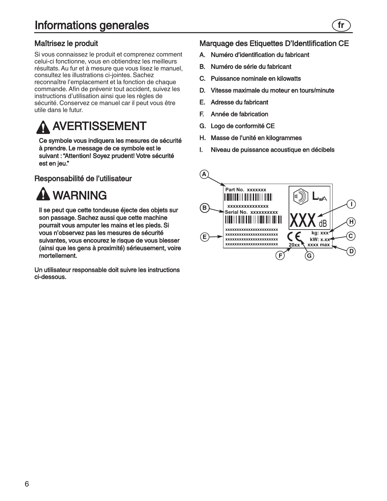 AVERTISSEMENT: projection d’objets. Gardez vos distances. Lire le manuel de l’utilisateur avant de mettre la tondeuse en marche.
