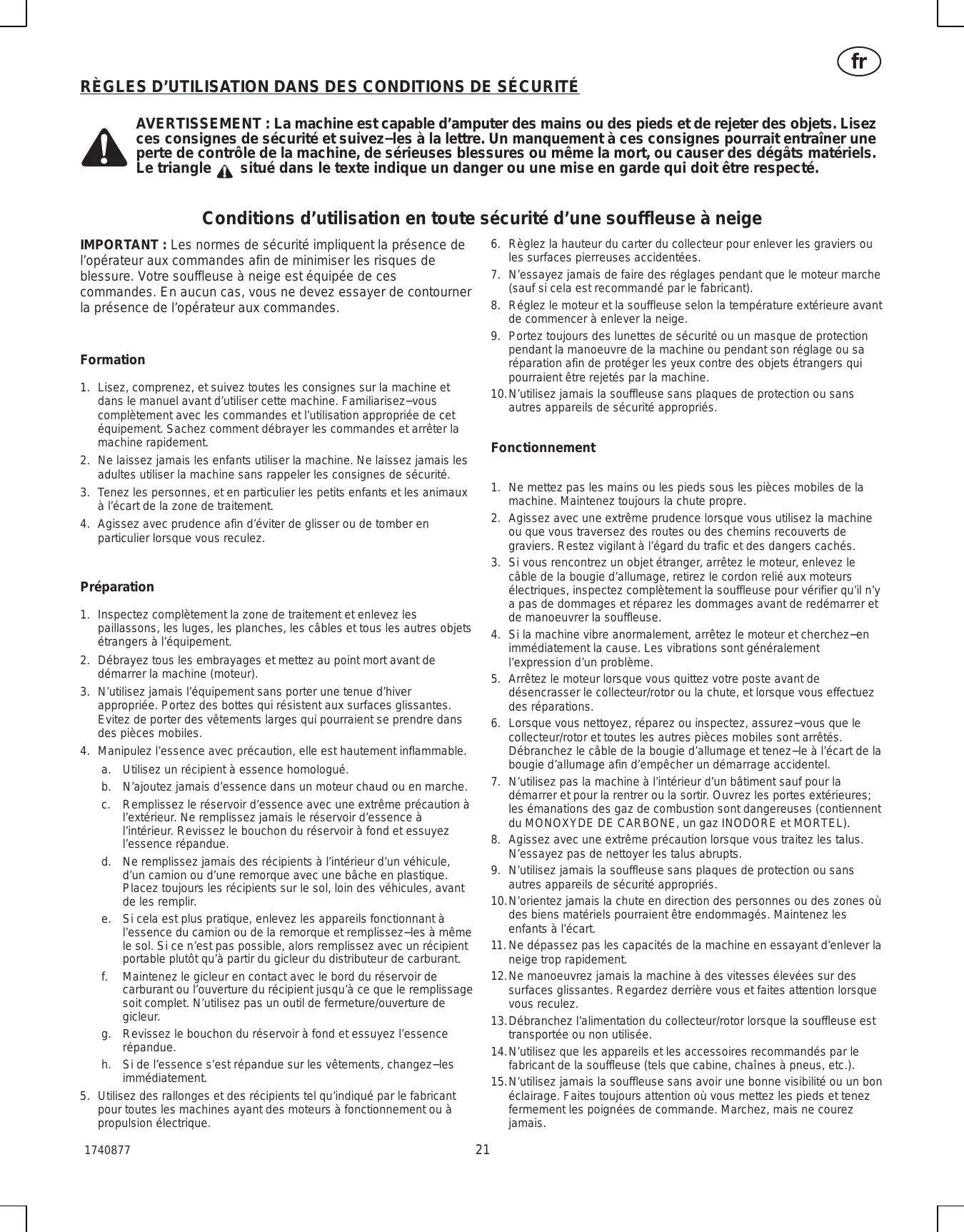 1. Inspectez complètement la zone de traitement et enlevez les paillassons, les luges, les planches, les câbles et tous les autres objets étrangers à l’équipement. 2. Débrayez tous les embrayages et mettez au point mort avant de démarrer la machine (moteur). 3. N’utilisez jamais l’équipement sans porter une tenue d’hiver appropriée. Portez des bottes qui résistent aux surfaces glissantes. Evitez de porter des vêtements larges qui pourraient se prendre dans des pièces mobiles. 4. Manipulez l’essence avec précaution, elle est hautement inflammable. a. Utilisez un récipient à essence homologué. b. N’ajoutez jamais d’essence dans un moteur chaud ou en marche. c. Remplissez le réservoir d’essence avec une extrême précaution à l’extérieur. Ne remplissez jamais le réservoir d’essence à l’intérieur. Revissez le bouchon du réservoir à fond et essuyez l’essence répandue. d. Ne remplissez jamais des récipients à l’intérieur d’un véhicule, d’un camion ou d’une remorque avec une bâche en plastique. Placez toujours les récipients sur le sol, loin des véhicules, avant de les remplir. e. Si cela est plus pratique, enlevez les appareils fonctionnant à l’essence du camion ou de la remorque et remplissez−les à même le sol. Si ce n’est pas possible, alors remplissez avec un récipient portable plutôt qu’à partir du gicleur du distributeur de carburant. f. Maintenez le gicleur en contact avec le bord du réservoir de carburant ou l’ouverture du récipient jusqu’à ce que le remplissage soit complet. N’utilisez pas un outil de fermeture/ouverture de gicleur. g. Revissez le bouchon du réservoir à fond et essuyez l’essence répandue. h. Si de l’essence s’est répandue sur les vêtements, changez−les immédiatement. 5. Utilisez des rallonges et des récipients tel qu’indiqué par le fabricant pour toutes les machines ayant des moteurs à fonctionnement ou à propulsion électrique. 1740877