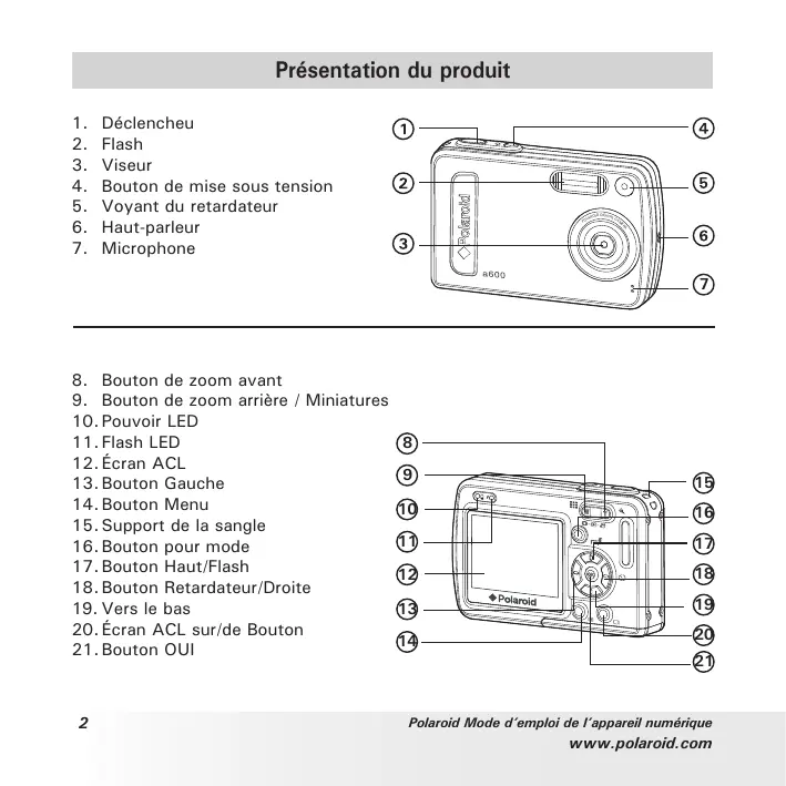 Mode d’emploi a600 6.0 Megapixel de l’appareil mérique www.polaroid.com Présentation du produit Déclencheu Flash Viseur Bouton de mise sous tension Voyant du retardateur Haut-parleur Microphone