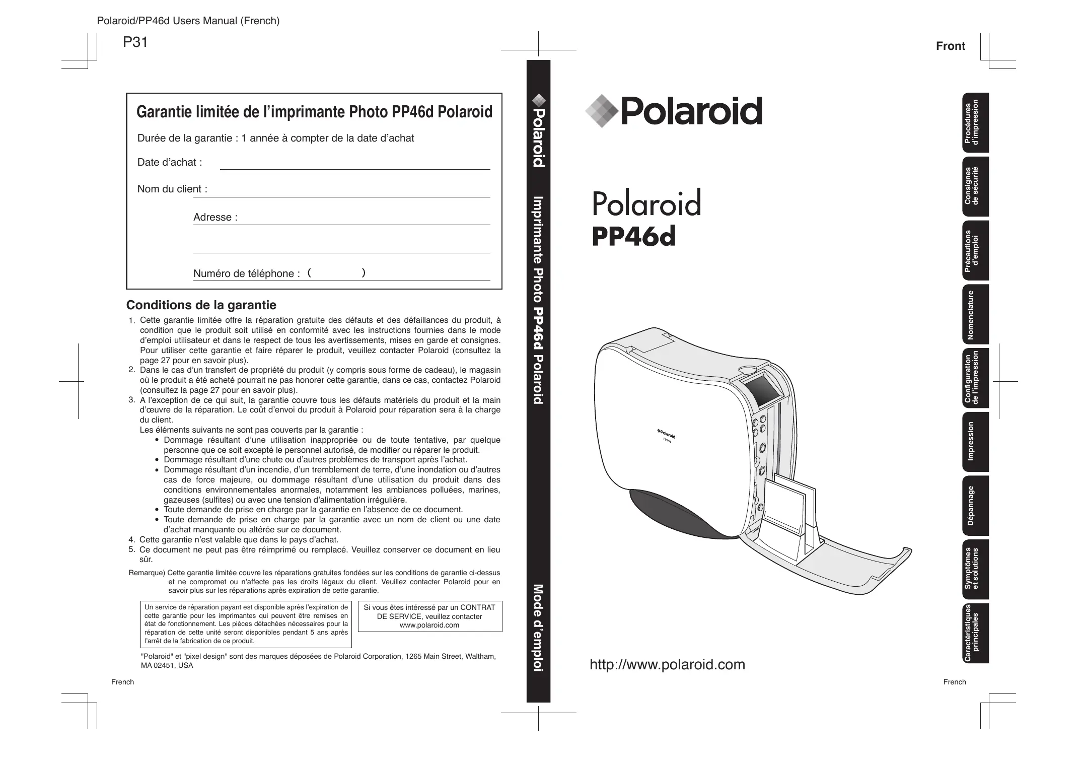 sûr. Dépannage Conditions de la garantie Symptômes et solutions Numéro de téléphone : http://www.polaroid.com Caractéristiques principales Adresse : Imprimante Photo PP46d Polaroid Nom du client : Consignes de sécurité Date d’achat : French Polaroid/PP46d Users Manual (French) Préface Vérification du contenu de la boîte Nous vous remercions d’avoir acheté l’imprimante Polaroid PP46d. A l’ouverture, veuillez vérifier que la boîte contient bien tous les éléments suivants : Veuillez lire attentivement ce mode d’emploi et la garantie jointe avant utilisation. Veuillez conserver ce mode d’emploi dans un endroit facilement accessible. Table des matières Vérification du contenu de la boîte