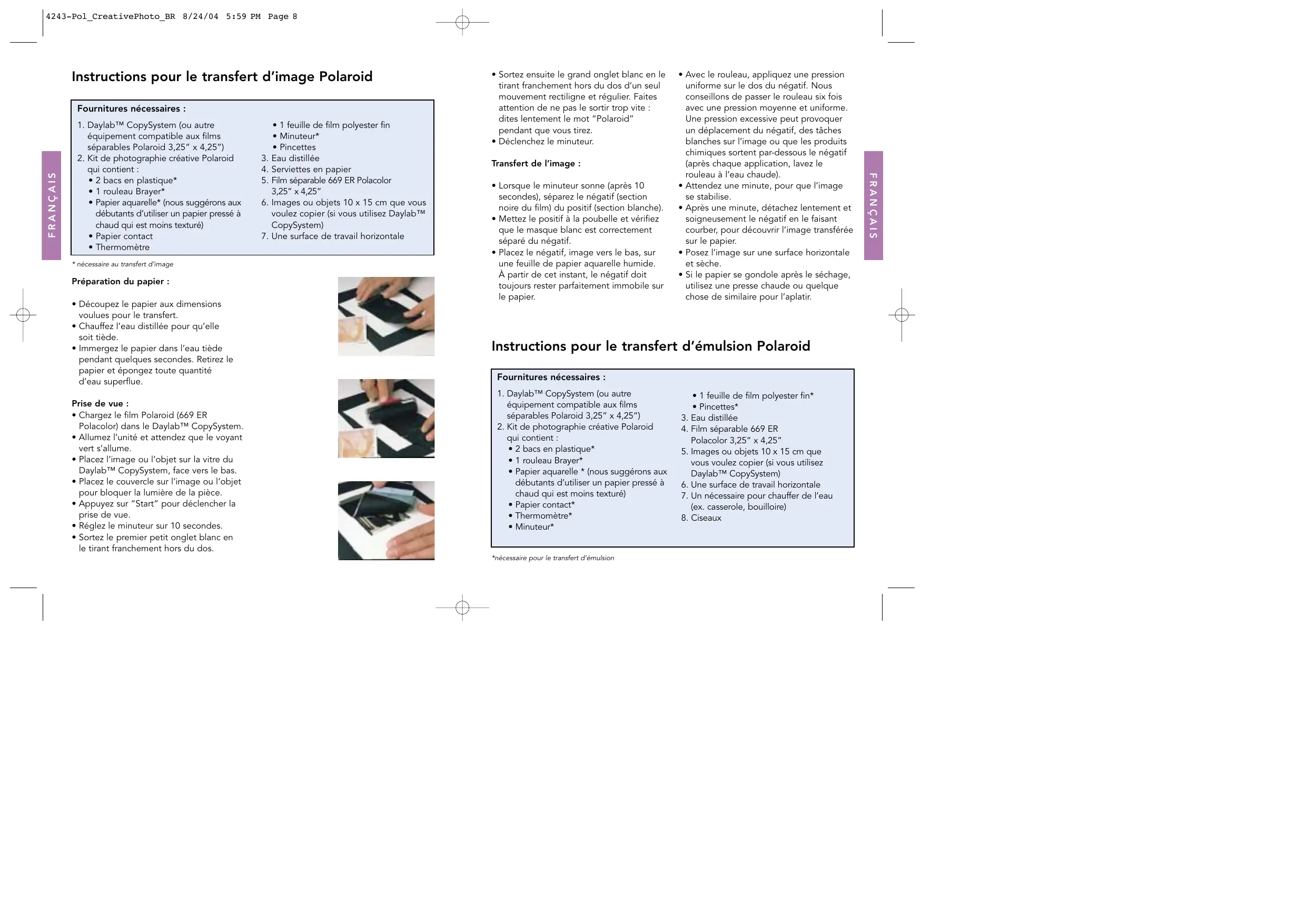 aérée par une fenêtre ouverte ou un ventilateur d’extraction. Glossaire : Film séparable : La plupart des gens pensent qu’un film Polaroid est une image carrée bordée de blanc qui se développe seule dans un “sandwich” de plusieurs couches (film Polaroid 600). Les films séparables sont la première génération de films Polaroid. Ils se ressemblent en ce qu’ils s’autodéveloppent, mais ils doivent être manuellement extraits du dos de l’appareil photo, pour étaler les produits chimiques sur la base film et provoquer le développement de l’image. Pour voir l’image finale, le négatif doit être séparé du positif lorsque la photographie est totalement développée. Négatif Polaroid : Image sur papier "négatif" long contenant la poche de produit chimique, avec un onglet blanc marqué de flèches noires. Cette partie doit normalement être mise à la poubelle pour réaliser des tirages Polaroid traditionnels. L’image est impressionnée sur le négatif. Lorsque l’utilisateur sort le film du dos en le passant à travers les rouleaux, il provoque l’étalage des produits chimiques et le transfert de l’image du négatif sur le positif. C’est pourquoi, pour réaliser un transfert d’image, il est nécessaire de séparer prématurément le positif du négatif pour éviter que l’image passe sur le positif, afin de pouvoir la transférer sur du papier aquarelle à partir du négatif. Positif Polaroid : Image ou "tirage". Pour les transferts d’images, cette image est une version pâle de la scène originale. Le positif a quatre bordures blanches égales et un code de fabrication imprimé au dos (lettres et chiffres). Ce positif ou tirage ressemble tout à fait à un tirage normal réalisé avec un appareil photo 35 mm. Pendant le développement, l’image est transférée du négatif sur le positif. A la fin du développement, la totalité de l’image est passée sur le positif et le photographe peut séparer le négatif du positif pour voir l’image finale. La couche supérieure du positif Polaroid contient l’émulsion qui peut être détachée et déposée sur un autre support, grâce au processus de transfert d’émulsion. Daylab™ CopySystem : Equipement fabriqué par Daylab Corporation qui ressemble à photocopieur conventionnel, mais qui permet de dupliquer une photo ou un objet sur un film séparable Polaroid. Daylab™ CopySystem est commercialisé par des boutiques photos et des sites internet (www.daylab.com). Poche : Portion du film séparable qui contient les produits chimiques nécessaires au développement. Cette poche se brise et son contenu se répand sur le film lorsqu’il sort du dos en passant entre les rouleaux. 669 ER Polacolor : Nom du film compatible aux transferts d’image et d’émulsion. Polaroid fabrique plusieurs types de films en différents formats. Le 669 ER Polacolor est un film couleur séparable mesurant 3,25” x 4,25”. Il peut être acheté dans des boutiques photos et sur des sites internet. Papier pressé à chaud : Le papier aquarelle est commercialisé sous différents formats et styles. Si vous débutez, Polaroid conseille d’utiliser du papier pressé à chaud, parce qu’il est plus lisse que les autres et donc plus facile à utiliser. Selon vos progrès en manipulation, vous pourrez choisir des papiers et des surfaces plus texturées. Emulsion Polaroid : les différentes couches du film Polaroid contenant les teintures composant la photographie. RESSOURCES :