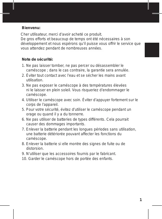 Bienvenu: Cher utilisateur, merci d’avoir acheté ce produit. De gros efforts et beaucoup de temps ont été nécessaires à son développement et nous espérons qu’il puisse vous offrir le service que vous attendez pendant de nombreuses années. Note de sécurité: