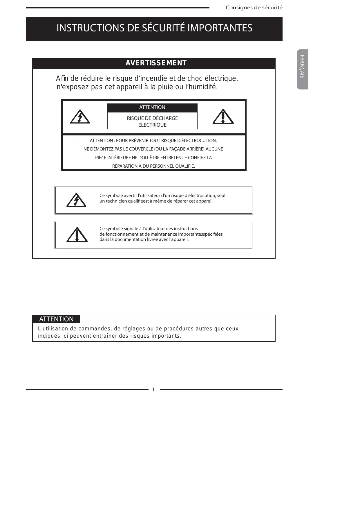 ÉLECTRIQUE ATTENTION : POUR PRÉVENIR TOUT RISQUE D'ÉLECTROCUTION, NE DÉMONTEZ PAS LE COUVERCLE (OU LA FAÇADE ARRIÈRE).AUCUNE PIÈCE INTÉRIEURE NE DOIT ÊTRE ENTRETENUE.CONFIEZ LA RÉPARATION À DU PERSONNEL QUALIFIÉ. Ce symbole avertit l'utilisateur d'un risque d'électrocution, seul un technicien qualifiéest à même de réparer cet appareil. Ce symbole signale à l'utilisateur des instructions de fonctionnement et de maintenance importantesspécifiées dans la documentation livrée avec l'appareil. ATTENTION L'utilisation de commandes, de réglages ou de procédures autres que ceux indiqués ici peuvent entraîner des risques importants.