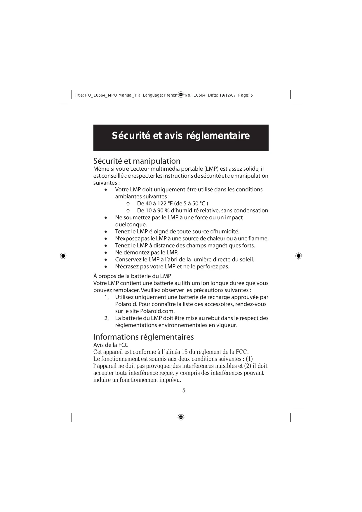 Titl Title: PO_10664_MPU Manual_FR Language: French FI No.: 10664 Date: 19/12/07 Page: 5 Sécurité et avis réglementaire Sécurité et manipulation Même si votre Lecteur multimédia portable (LMP) est assez solide, il est conseillé de respecter les instructions de sécurité et de manipulation suivantes :