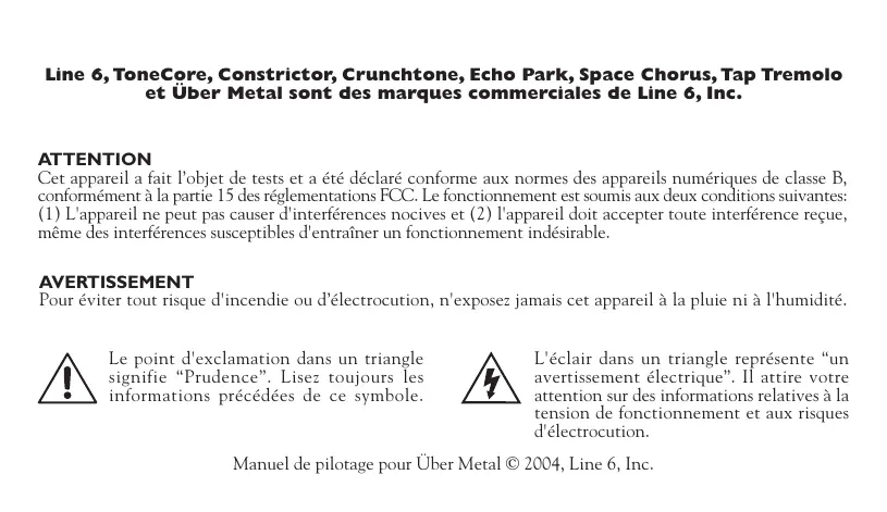 Line 6, ToneCore, Constrictor, Crunchtone, Echo Park, Space Chorus, Tap Tremolo et Über Metal sont des marques commerciales de Line 6, Inc. ATTENTION Cet appareil a fait l’objet de tests et a été déclaré conforme aux normes des appareils numériques de classe B, conformément à la partie 15 des réglementations FCC. Le fonctionnement est soumis aux deux conditions suivantes: (1) L'appareil ne peut pas causer d'interférences nocives et (2) l'appareil doit accepter toute interférence reçue, même des interférences susceptibles d'entraîner un fonctionnement indésirable. AVERTISSEMENT Pour éviter tout risque d'incendie ou d’électrocution, n'exposez jamais cet appareil à la pluie ni à l'humidité. Le point d'exclamation dans un triangle signifie “Prudence”. Lisez toujours les informations précédées de ce symbole. L'éclair dans un triangle représente “un avertissement électrique”. Il attire votre attention sur des informations relatives à la tension de fonctionnement et aux risques d'électrocution. Manuel de pilotage pour Über Metal © 2004, Line 6, Inc. Lisez attentivement ces informations importantes liées à la sécurité. Conservez ce manuel en lieu sûr pour toute référence ultérieure. Avant d'utiliser votre ToneCore, lisez attentivement les consignes d'utilisation et de sécurité ci-dessous.