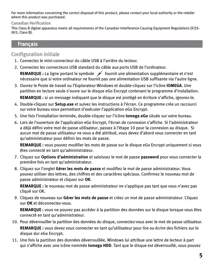 - Essayez de brancher les câbles sur d’autres ports USB de l’ordinateur. Si l’icône IOMEGA s’affiche, mais pas l’icône Iomega HDD de la partition des données, double-cliquez sur l’icône Iomega eGo située sur le bureau et entrez le mot de passe utilisateur pour déverrouiller le disque. La partition Iomega HDD est visible uniquement lorsque vous êtes connecté en tant qu’utilisateur. Si le problème persiste, visitez la section d’assistance sur le site www.iomega.com pour une aide supplémentaire au dépannage. Utilisation du disque Accès utilisateur Lorsque vous êtes connecté en tant qu’utilisateur, vous pouvez accéder à la partition des données Iomega HDD du disque eGo Encrypt. Cela vous permet d’afficher, de modifier et de créer des fichiers sur cette partition des données. La connexion utilisateur ne vous permet pas de modifier les mots de passe ou de procéder à l’effacement sécurisé du disque. Pensez à toujours vous déconnecter lorsque vous n’utilisez pas le disque pour garantir la sécurité de vos données. Si vous voulez déconnecter le périphérique USB, déconnectez-vous et suivez la procédure de retrait sécurisé de votre système d’exploitation. ATTENTION ! Pour éviter toute perte de données, ne déconnectez pas le lecteur pendant un transfert de données (voyant d’activité clignotant). Accès administrateur L’administrateur du disque peut définir ou modifier les mots de passe administrateur et utilisateur. Il peut également procéder à l’effacement sécurisé pour supprimer toutes les données du disque. La connexion administrateur ne permet pas l’accès à la partition des données du disque. Effacement sécurisé L’effacement sécurisé est une procédure irréversible supprimant toutes les données stockées sur la partition Iomega HDD. Pour effectuer l’effacement sécurisé, vous devez vous connecter en tant qu’administrateur. Une fois l’effacement terminé, vous devez formater la partition des données avec un système de fichiers NTFS. Pour le formatage de la partition des données, vous devez vous déconnecter et vous connecter en tant qu’utilisateur. Consultez le guide de l’utilisateur HTML pour obtenir des instructions détaillées.