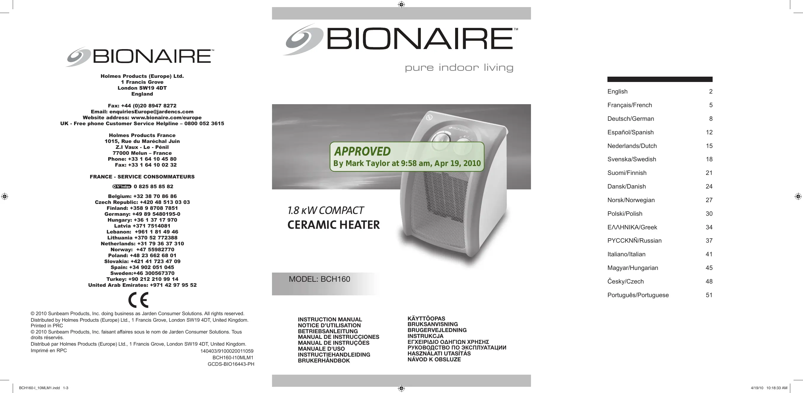 Retrouvez gratuitement la notice de l'appareil BCH160B-I BIONAIRE au format PDF.