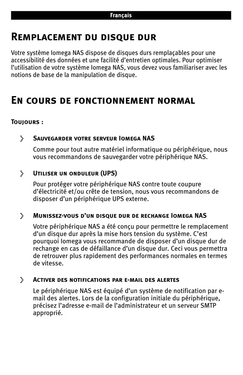 Munissez-vous d’un disque dur de rechange Iomega NAS Votre périphérique NAS a été conçu pour permettre le remplacement d’un disque dur après la mise hors tension du système. C’est pourquoi Iomega vous recommande de disposer d’un disque dur de rechange en cas de défaillance d’un disque dur. Ceci vous permettra de retrouver plus rapidement des performances normales en termes de vitesse.