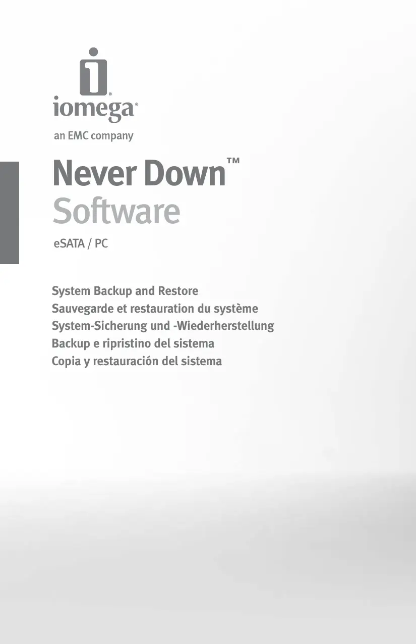 will start from the internal system drive. See the help included with the software for additional information on using Iomega Never Down software. Démarrage avec le logiciel Iomega Never Down Le logiciel Iomega Never Down est conçu pour fonctionner avec un disque dur eSATA Iomega afin de créer une copie d’amorçage du disque dur interne de l’ordinateur, y compris du système d’exploitation, des paramètres personnels, des applications logicielles et des fichiers de données. Cela vous permet de démarrer et d’exécuter votre ordinateur à partir de votre disque dur Iomega en cas de sinistre informatique, ainsi que de restaurer votre système à partir de la sauvegarde Never Down. Sauvegarde de votre système Créez une nouvelle sauvegarde Never Down afin de sauvegarder automatiquement toutes les partitions sur le disque du système interne de votre ordinateur. IMPORTANT ! Si votre système est contaminé par un virus, il sera copié sur votre sauvegarde Never Down. Assurez-vous que votre système est en état de marche avant de créer une sauvegarde ! 1. Installez le logiciel Iomega Never Down à partir du CD Solutions fourni avec votre disque dur eSATA ou téléchargez-le à partir de la section « Support et Téléchargements » du site www.iomega.com.