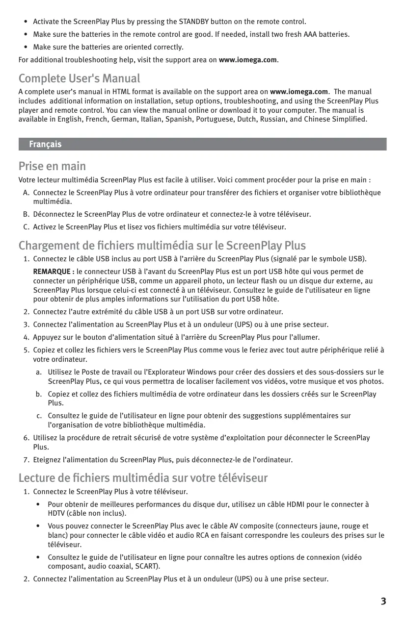 - Make sure the batteries are oriented correctly. For additional troubleshooting help, visit the support area on www.iomega.com. Complete User's Manual A complete user’s manual in HTML format is available on the support area on www.iomega.com. The manual includes additional information on installation, setup options, troubleshooting, and using the ScreenPlay Plus player and remote control. You can view the manual online or download it to your computer. The manual is available in English, French, German, Italian, Spanish, Portuguese, Dutch, Russian, and Chinese Simplified. Prise en main Votre lecteur multimédia ScreenPlay Plus est facile à utiliser. Voici comment procéder pour la prise en main : A. Connectez le ScreenPlay Plus à votre ordinateur pour transférer des fichiers et organiser votre bibliothèque multimédia. B. Déconnectez le ScreenPlay Plus de votre ordinateur et connectez-le à votre téléviseur. C. Activez le ScreenPlay Plus et lisez vos fichiers multimédia sur votre téléviseur. Chargement de fichiers multimédia sur le ScreenPlay Plus
