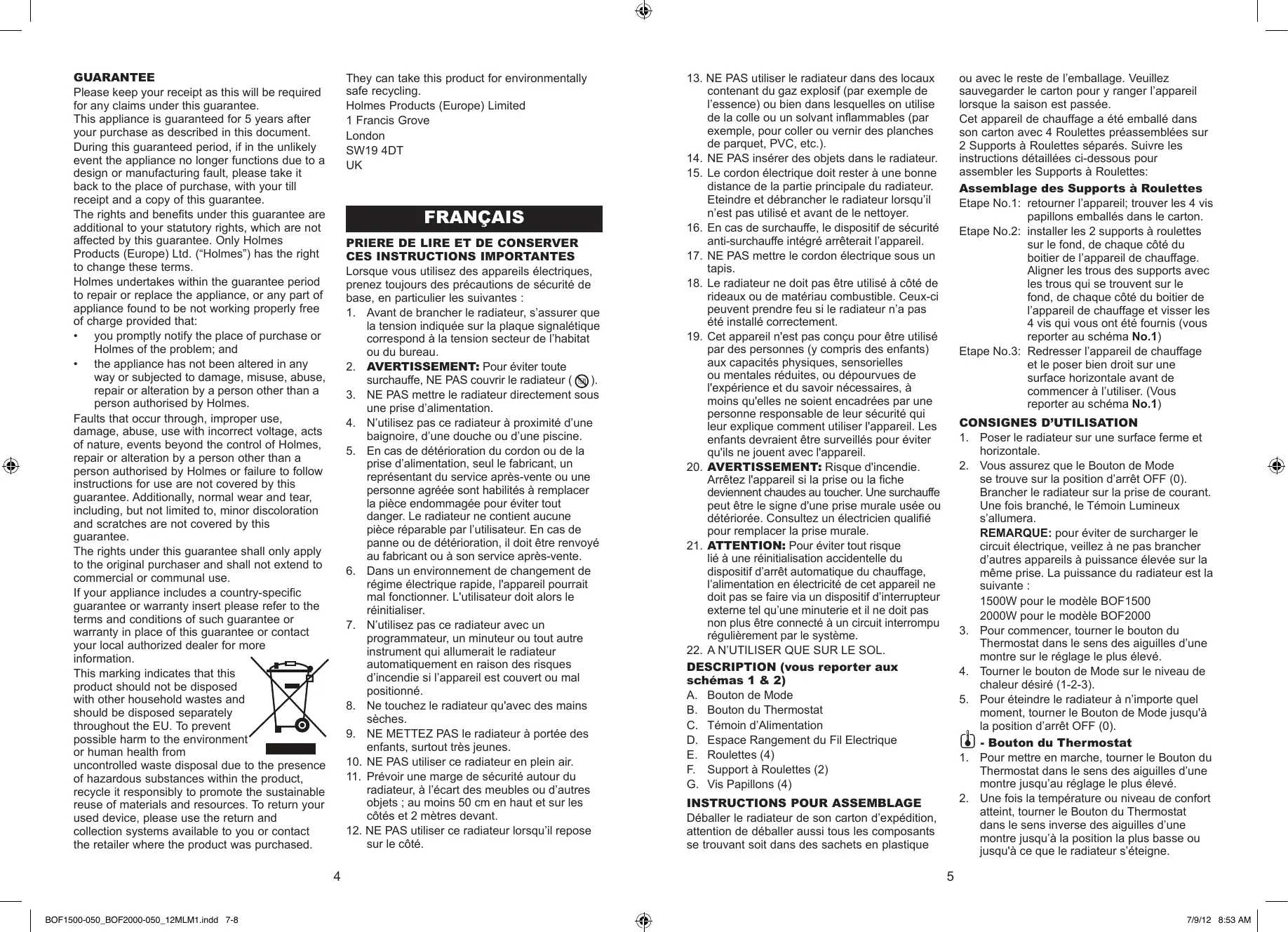 Cet appareil est garanti 5 ans à partir de la date d’achat, comme indiqué dans le présent document. Dans le cas peu probable d’une panne résultant d’un défaut de conception ou de fabrication au cours de la période de garantie, veuillez rapporter l’appareil au magasin où vous l’avez acheté avec votre ticket de caisse et une copie de cette garantie. Vos droits statutaires ne sont aucunement affectés par cette garantie. Seul Holmes Products (Europe) Ltd. (« Holmes ») peut modifier ces dispositions. Holmes s’engage à réparer ou remplacer gratuitement, pendant la période de garantie,