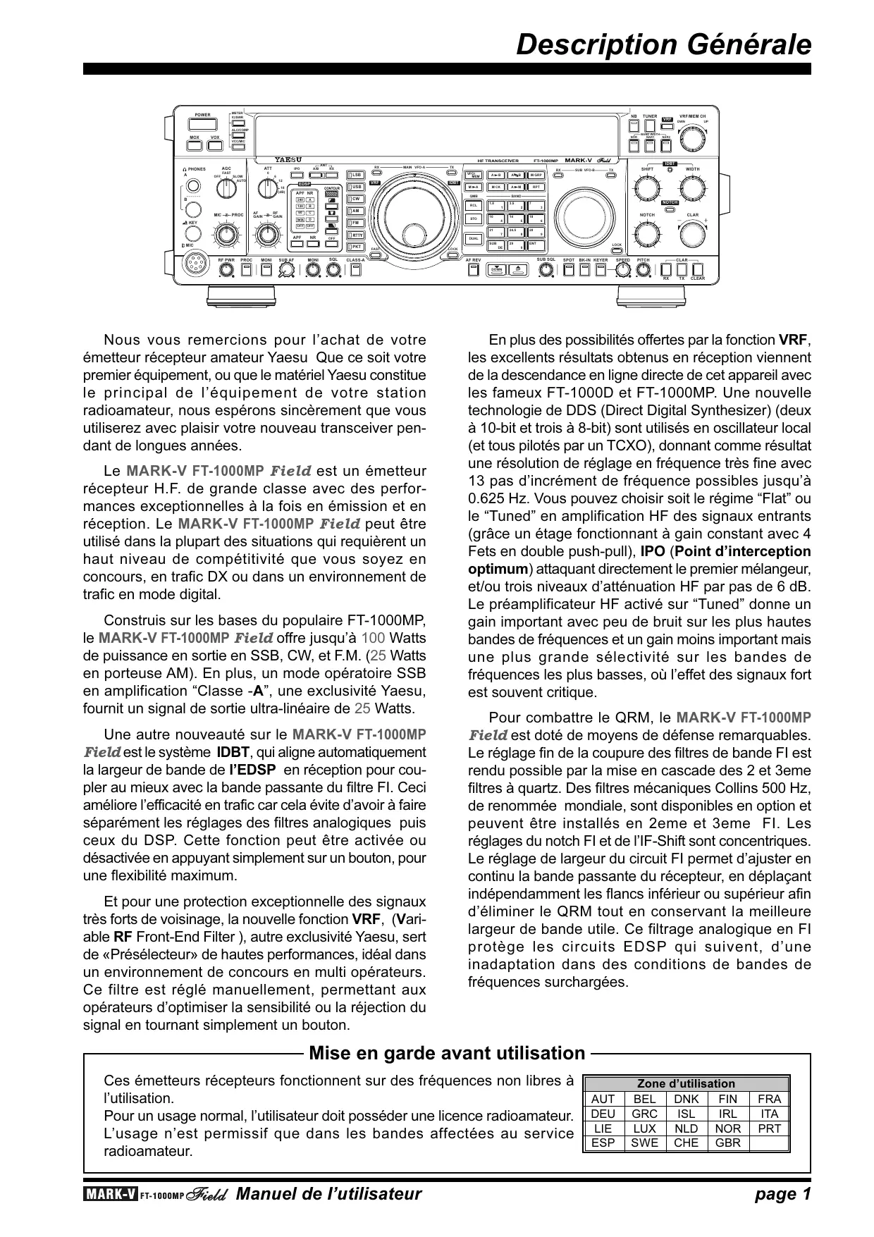 SUB SQL AF REV DOWN SPOT BK-IN KEYER SPEED PITCH CLAR UP RX Nous vous remercions pour l’achat de votre émetteur récepteur amateur Yaesu Que ce soit votre premier équipement, ou que le matériel Yaesu constitue le principal de l’équipement de votre station radioamateur, nous espérons sincèrement que vous utiliserez avec plaisir votre nouveau transceiver pendant de longues années. Le MARK-V FT-1000MP Field est un émetteur récepteur H.F. de grande classe avec des performances exceptionnelles à la fois en émission et en réception. Le MARK-V FT-1000MP Field peut être utilisé dans la plupart des situations qui requièrent un haut niveau de compétitivité que vous soyez en concours, en trafic DX ou dans un environnement de trafic en mode digital. Construis sur les bases du populaire FT-1000MP, le MARK-V FT-1000MP Field offre jusqu’à 100 Watts de puissance en sortie en SSB, CW, et F.M. (25 Watts en porteuse AM). En plus, un mode opératoire SSB en amplification “Classe -A”, une exclusivité Yaesu, fournit un signal de sortie ultra-linéaire de 25 Watts. Une autre nouveauté sur le MARK-V FT-1000MP Field est le système IDBT, qui aligne automatiquement la largeur de bande de l’EDSP en réception pour coupler au mieux avec la bande passante du filtre FI. Ceci améliore l’efficacité en trafic car cela évite d’avoir à faire séparément les réglages des filtres analogiques puis ceux du DSP. Cette fonction peut être activée ou désactivée en appuyant simplement sur un bouton, pour une flexibilité maximum. Et pour une protection exceptionnelle des signaux très forts de voisinage, la nouvelle fonction VRF, (Variable RF Front-End Filter ), autre exclusivité Yaesu, sert de «Présélecteur» de hautes performances, idéal dans un environnement de concours en multi opérateurs. Ce filtre est réglé manuellement, permettant aux opérateurs d’optimiser la sensibilité ou la réjection du signal en tournant simplement un bouton.