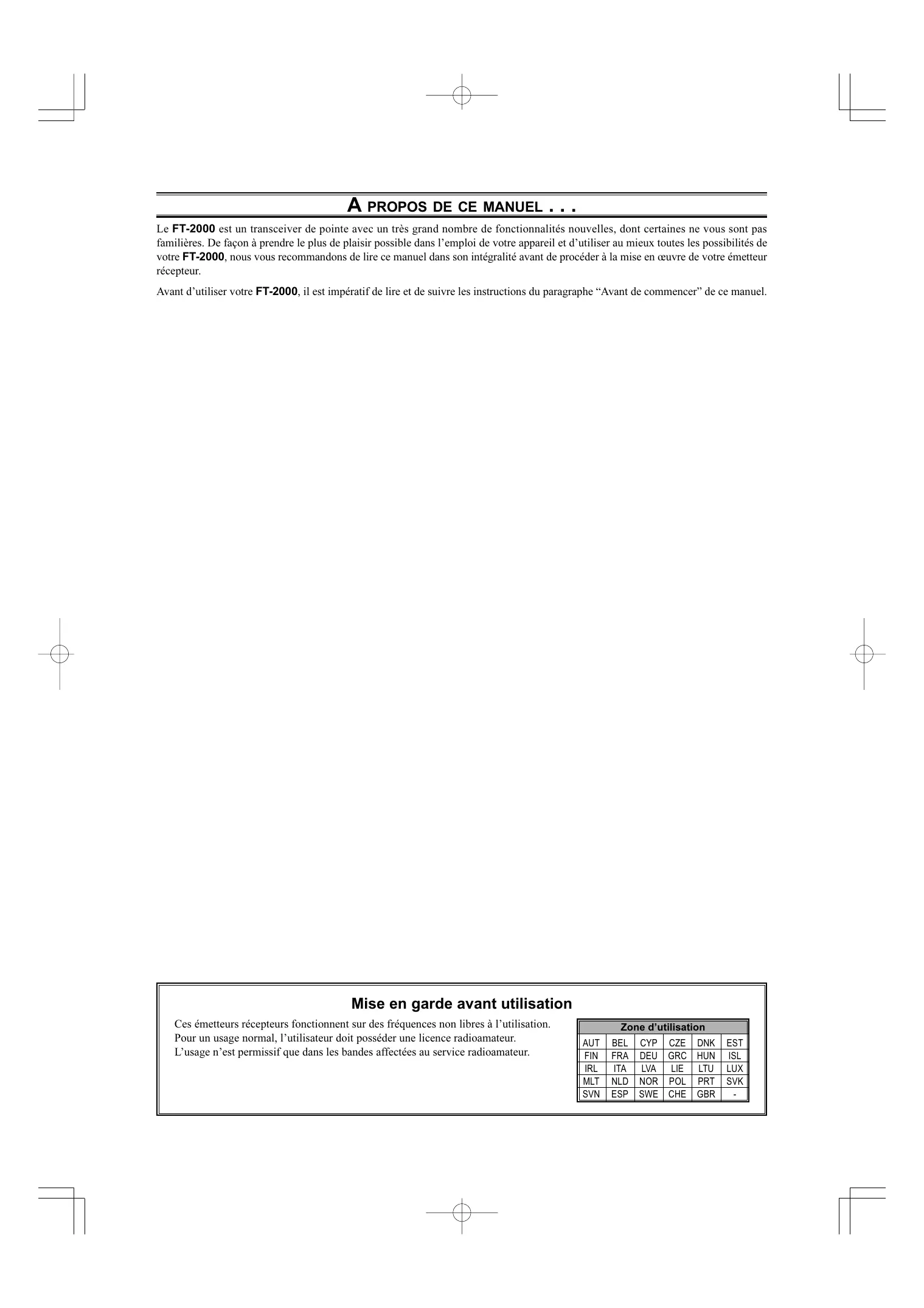 A PROPOS DE CE MANUEL . . . Le FT-2000 est un transceiver de pointe avec un très grand nombre de fonctionnalités nouvelles, dont certaines ne vous sont pas familières. De façon à prendre le plus de plaisir possible dans l’emploi de votre appareil et d’utiliser au mieux toutes les possibilités de votre FT-2000, nous vous recommandons de lire ce manuel dans son intégralité avant de procéder à la mise en œuvre de votre émetteur récepteur. Avant d’utiliser votre FT-2000, il est impératif de lire et de suivre les instructions du paragraphe “Avant de commencer” de ce manuel.