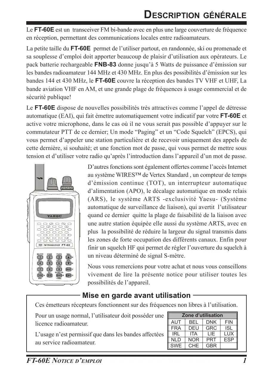 Le FT-60E est un transceiver FM bi-bande avec en plus une large couverture de fréquence en réception, permettant des communications locales entre radioamateurs. La petite taille du FT-60E permet de l’utiliser partout, en randonnée, ski ou promenade et sa souplesse d’emploi doit apporter beaucoup de plaisir d’utilisation aux opérateurs. Le pack batterie rechargeable FNB-83 donne jusqu’à 5 Watts de puissance d’émission sur les bandes radioamateur 144 MHz et 430 MHz. En plus des possibilités d’émission sur les bandes 144 et 430 MHz, le FT-60E couvre la réception des bandes TV VHF et UHF, La bande aviation VHF en AM, et une grande plage de fréquences à usage commercial et de sécurité publique! Le FT-60E dispose de nouvelles possibilités très attractives comme l’appel de détresse automatique (EAI), qui fait émettre automatiquement votre indicatif par votre FT-60E et active votre microphone, dans le cas où il ne vous serait pas possible d’appuyer sur le commutateur PTT de ce dernier; Un mode “Paging” et un “Code Squelch” (EPCS), qui vous permet d’appeler une station particulière et de recevoir uniquement des appels de cette dernière, si souhaité; et une fonction mot de passe, qui vous permet de mettre sous tension et d’utiliser votre radio qu’après l’introduction dans l’appareil d’un mot de passe. D’autres fonctions sont également offertes comme l’accès Internet au système WIRES™ de Vertex Standard , un compteur de temps d’émission continue (TOT), un interrupteur automatique d’alimentation (APO), le décalage automatique en mode relais (ARS), le système ARTS -exclusivité Yaesu- (Système automatique de surveillance de liaison), qui avertit l’utilisateur quand ce dernier quitte la plage de faisabilité de la liaison avec une autre station équipée elle aussi du système ARTS, avec en plus la possibilité de réduire la largeur du signal transmis dans les zones de forte occupation des différents canaux. Enfin pour finir un squelch HF qui permet de régler l’ouverture du squelch à un niveau déterminé de signal S-mètre. Nous vous remercions pour votre achat et nous vous conseillons vivement de lire la présente notice pour utiliser toutes les possibilités de l’appareil. Mise en garde avant utilisation Ces émetteurs récepteurs fonctionnent sur des fréquences non libres à l’utilisation. Pour un usage normal, l’utilisateur doit posséder une licence radioamateur. L’usage n’est permissif que dans les bandes affectées au service radioamateur.