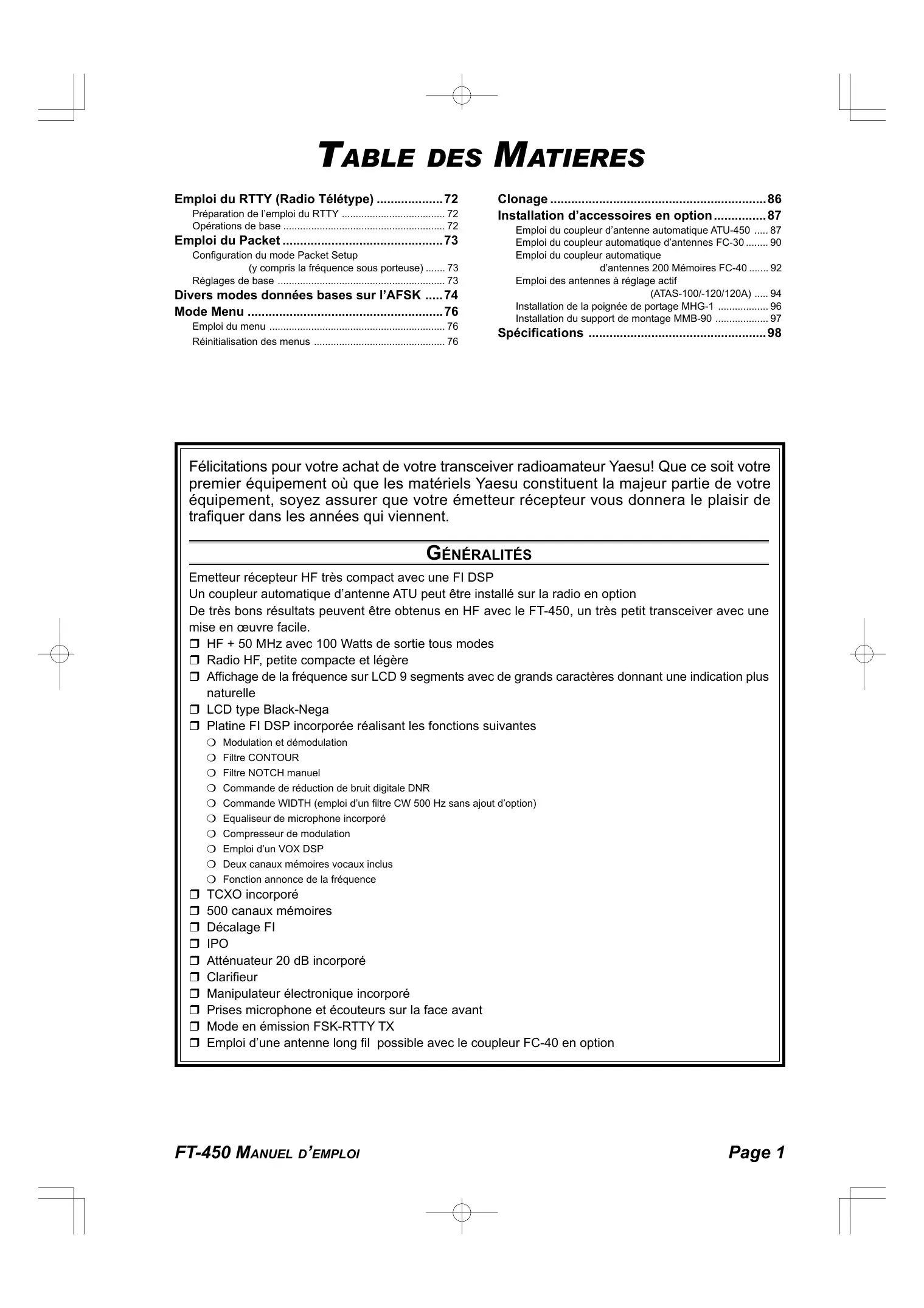 Félicitations pour votre achat de votre transceiver radioamateur Yaesu! Que ce soit votre premier équipement où que les matériels Yaesu constituent la majeur partie de votre équipement, soyez assurer que votre émetteur récepteur vous donnera le plaisir de trafiquer dans les années qui viennent.