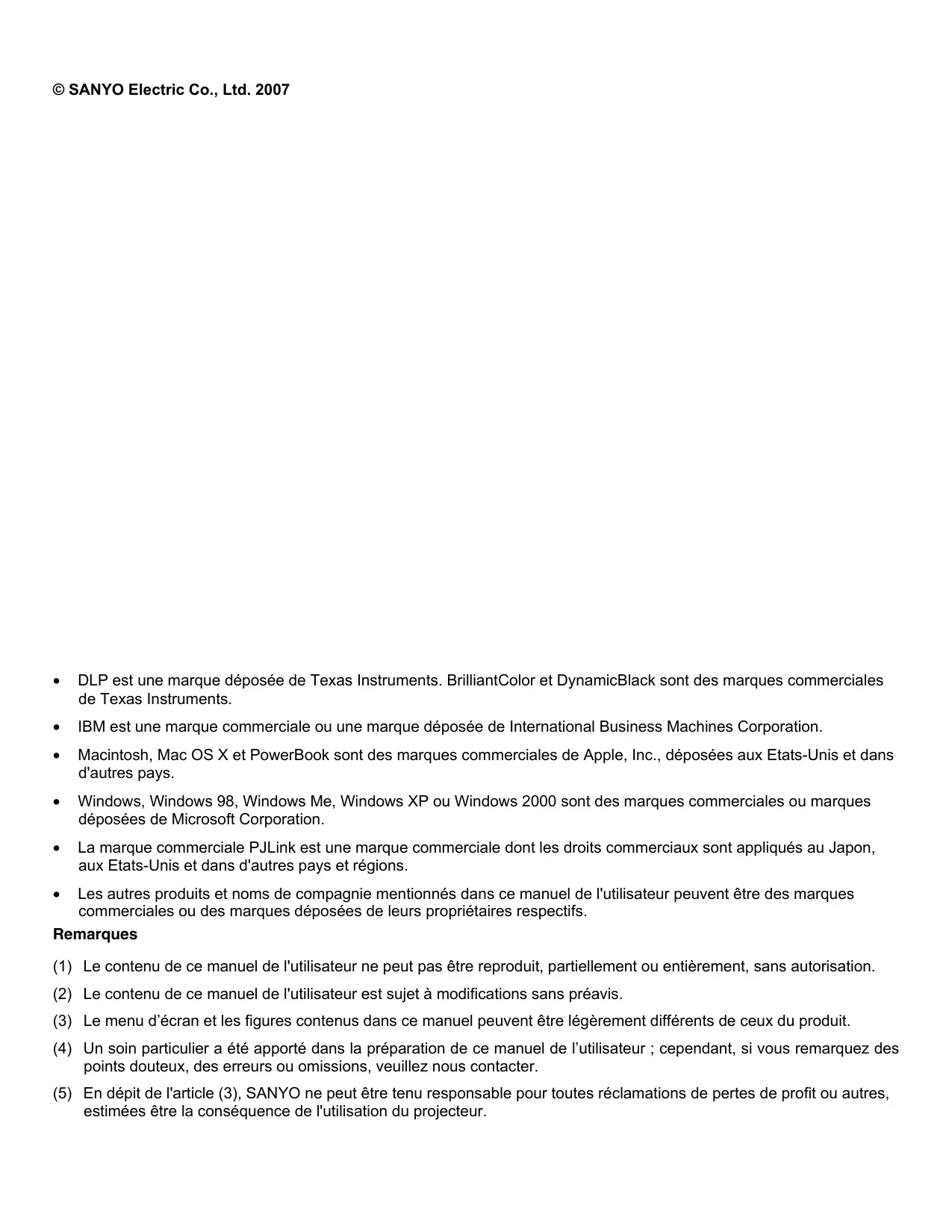 Les autres produits et noms de compagnie mentionnés dans ce manuel de l'utilisateur peuvent être des marques commerciales ou des marques déposées de leurs propriétaires respectifs. Remarques (1) Le contenu de ce manuel de l'utilisateur ne peut pas être reproduit, partiellement ou entièrement, sans autorisation. (2) Le contenu de ce manuel de l'utilisateur est sujet à modifications sans préavis. (3) Le menu d’écran et les figures contenus dans ce manuel peuvent être légèrement différents de ceux du produit. (4) Un soin particulier a été apporté dans la préparation de ce manuel de l’utilisateur ; cependant, si vous remarquez des points douteux, des erreurs ou omissions, veuillez nous contacter. (5) En dépit de l'article (3), SANYO ne peut être tenu responsable pour toutes réclamations de pertes de profit ou autres, estimées être la conséquence de l'utilisation du projecteur. Au propriétaire Avant d'installer et d'utiliser le projecteur, lisez entièrement ce manuel. Le projecteur offre de nombreuses fonctionnalités et fonctions commodes. Une utilisation adéquate du projecteur vous permet de gérer ces fonctionnalités et de le maintenir en bon état de fonctionnement pour de nombreuses années. Une utilisation incorrecte peut non seulement diminuer la longévité du produit, mais risque aussi d'entraîner des pannes, des risques d'incendie, et autres accidents. Si votre projecteur semble ne pas fonctionner correctement, relisez ce manuel, vérifiez les opérations et les connexions des câbles et essayez d'appliquer les solutions proposées dans la section “Troubleshooting” (Dépannage) au dos du livret. Si le problème persiste, contactez le vendeur chez qui vous avez acheté le projecteur ou le service clientèle. Consignes de sécurité