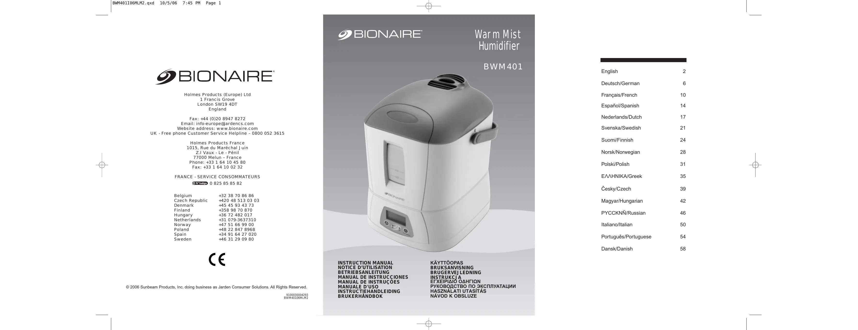 73/23/EEC, 89/336/EEC et 98/37/EEC. Les produits électriques usagés ne doivent pas être mélangés aux déchets ménagers. Veuillez recycler si vous en avez la possibilité. Visitez le site suivant pour des informations sur le recyclage et la mise au rebut: www.bionaire.com; ou envoyez un courrier électronique à info-europe@jardencs.com