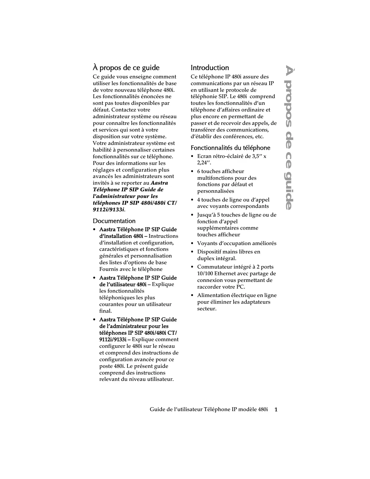 - Aastra Télephone IP SIP Guide de l'administrateur pour les téléphones IP SIP 480i/480i CT/9112i/9133i - Explique comment configurer le 480i sur le réseau et comprend des instructions de configuration avancée pour ce poste 480i. Leprésent guide comprend des instructions relevant du niveau utilisateur.
