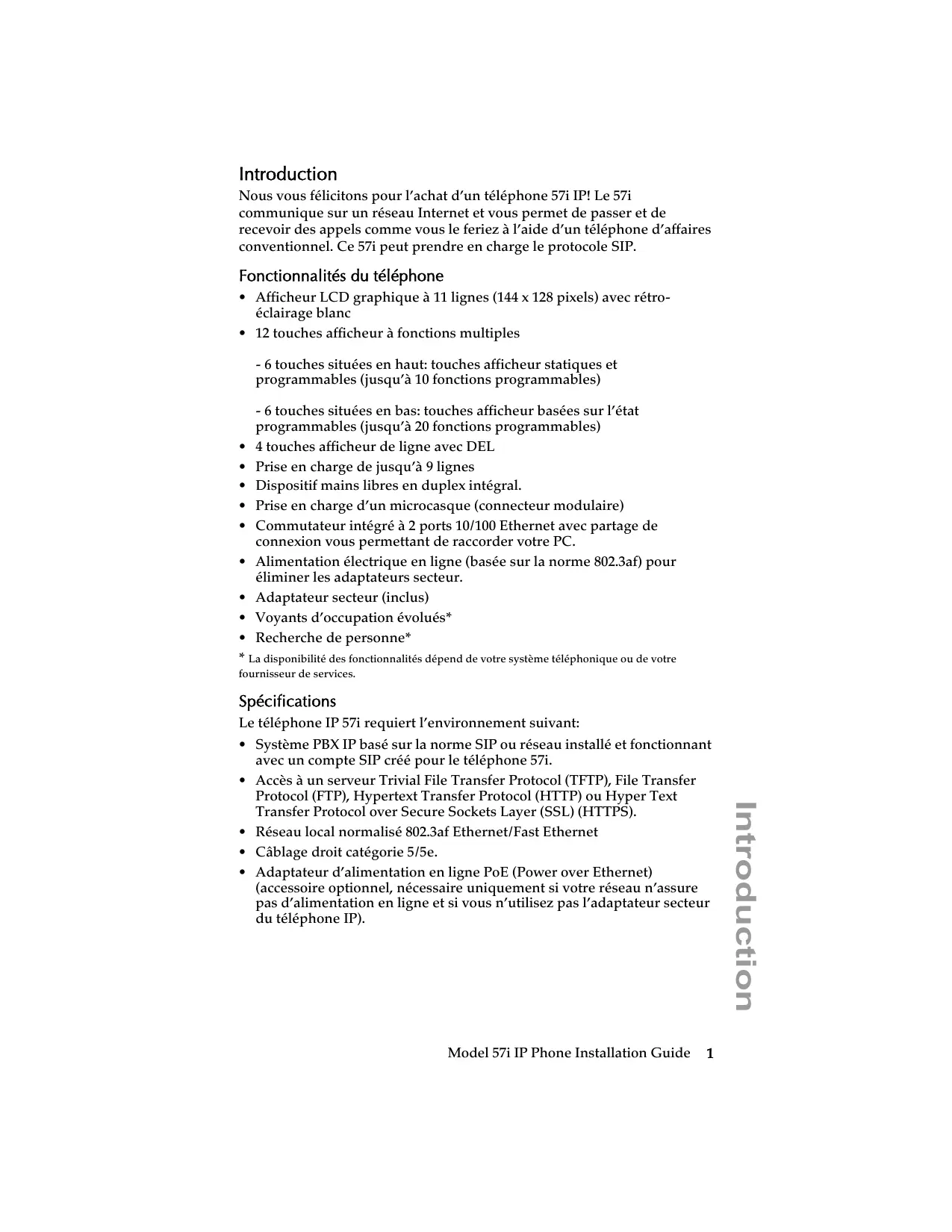 Nous vous félicitons pour l'achat d'un téléphone 57i IP! Le 57i communique sur un réseau Internet et vous permet de passer et de receivevoir des appeals comme vous le feriez à l'aide d'un téléphone d'affaires conventionnel. Ce 57i peut prendre en charge le protocole SIP.