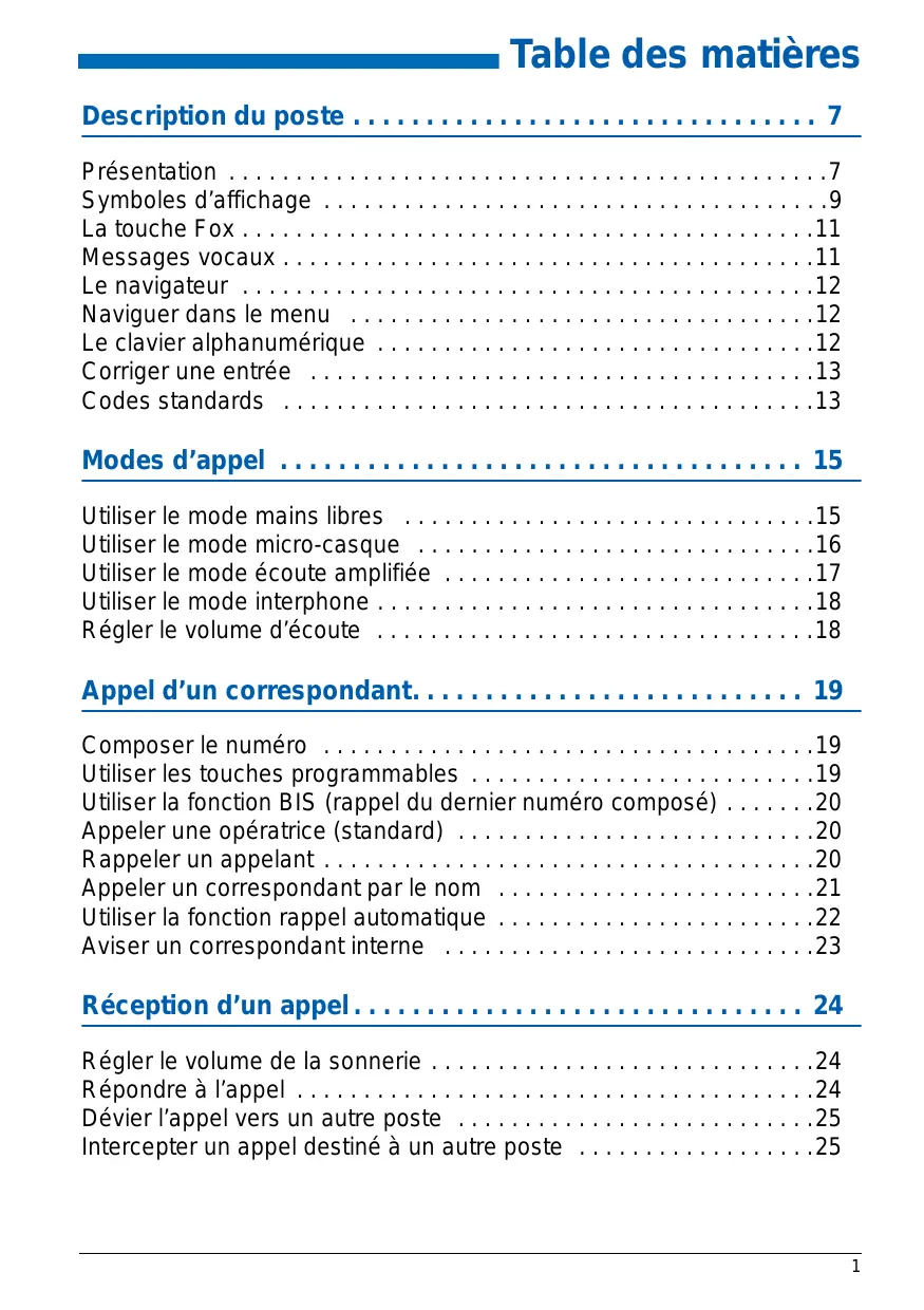 Annexes Un problème ? Vérifier... Défaut observé Causes possibles Pas d’affichage Vérifiez que le poste est raccordé à la ligne (tonalité dans l’écouteur). Vérifiez le cordon de raccordement à la ligne. Vérifiez que les autres postes de l’installation fonctionnent. Vérifiez le réglage du contraste de l’afficheur. Pas de tonalité Vérifiez que le poste est raccordé à la ligne (affichage). Vérifiez le cordon de raccordement au combiné. Vérifiez que les autres postes de l’installation fonctionnent. Vérifiez le réglage du volume du combiné, du haut-parleur ou du micro-casque. Pas d’écoute Vérifiez le réglage du volume du combiné, du haut-parleur ou du micro-casque. Pas d’accès à l’extérieur Vérifiez que vous avez le droit de communiquer avec l'extérieur. Vérifiez que votre poste n'est pas verrouillé ou que vous avez composé le bon code personnel. Messages affichés dans une langue étrangère Vérifiez le choix de la langue de l'afficheur. Pas de réception de messages vocaux Vérifiez votre raccordement à un système de messagerie vocale. Vérifiez l'enregistrement de votre signature vocale ou de votre message d'accueil. Vérifiez l'activation du renvoi des appels sur votre boîte vocale. En cas de problème particulier, nous vous conseillons de consulter votre exploitant système.