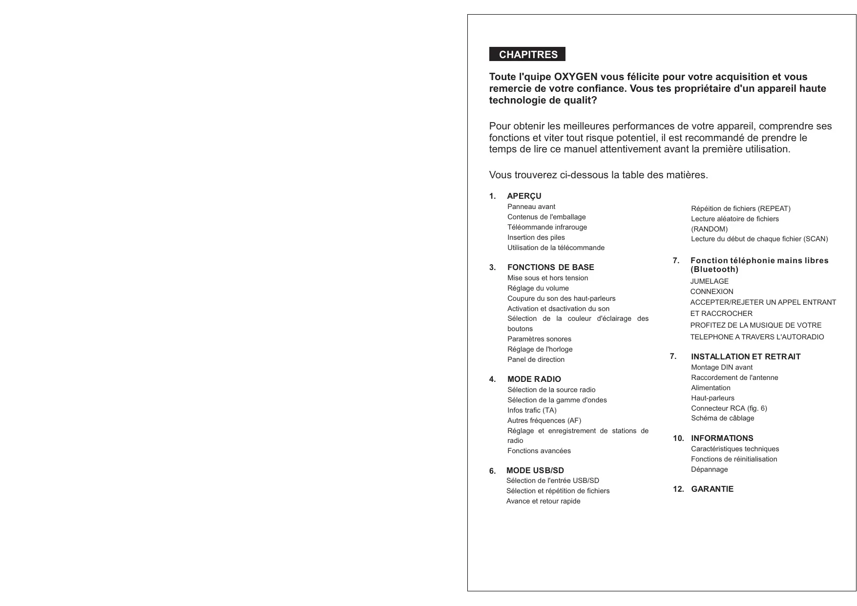 À TOUCHES À EFFLEUREMENT CHAPITRES Toute l'quipe OXYGEN vous félicite pour votre acquisition et vous remercie de votre confiance. Vous tes propriétaire d'un appareil haute technologie de qualit? Pour obtenir les meilleures performances de votre appareil, comprendre ses fonctions et viter tout risque potentiel, il est recommandé de prendre le temps de lire ce manuel attentivement avant la première utilisation. Vous trouverez ci-dessous la table des matières.