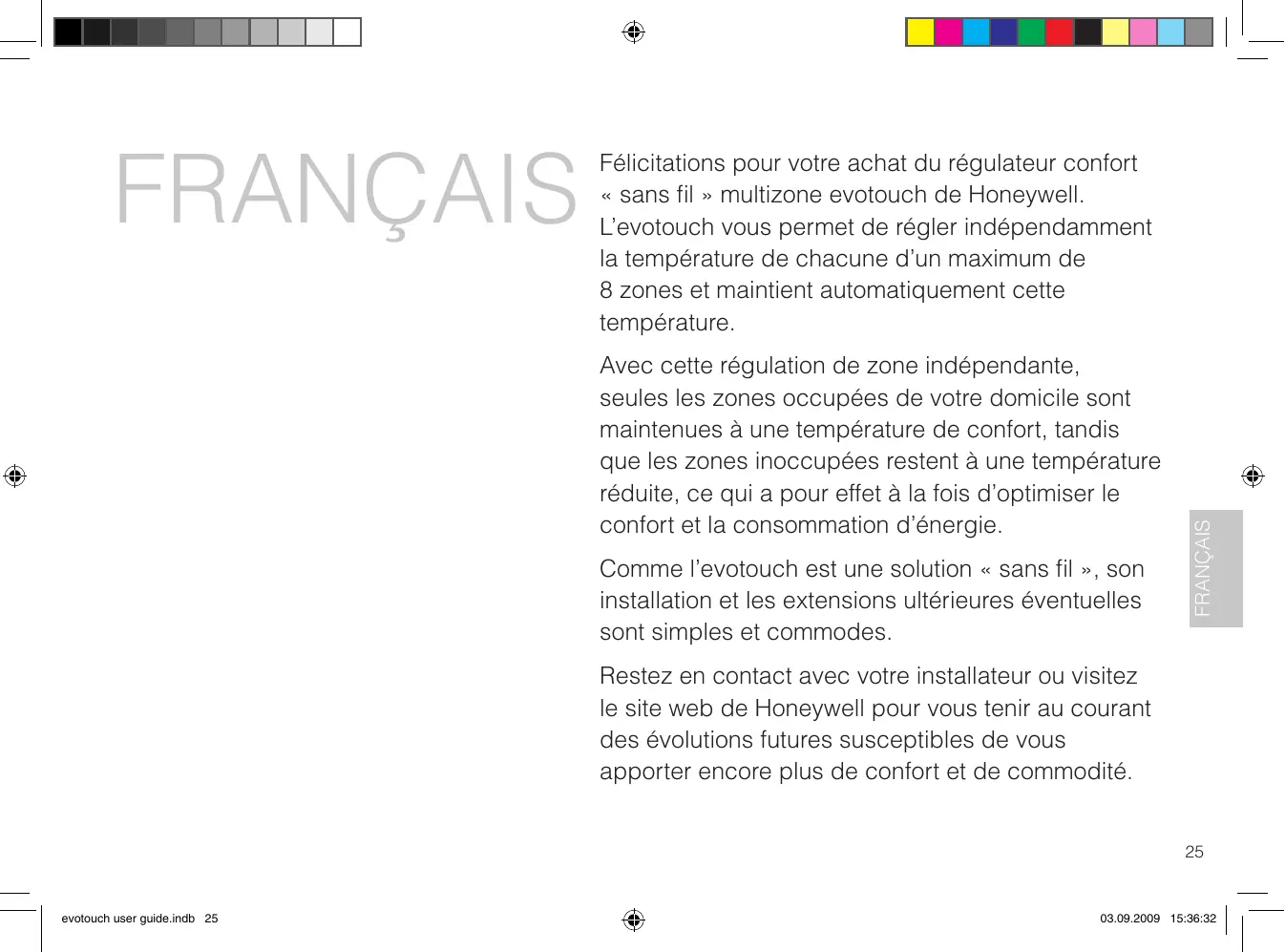 Félicitations pour votre achat du régulateur comport « sans fil » multizone evotouch de Honeywell. L'évotouch vous permet de régler indépendamen la température de chacune d'un maximum de 8 zones et maintainant automatiquement cette température.