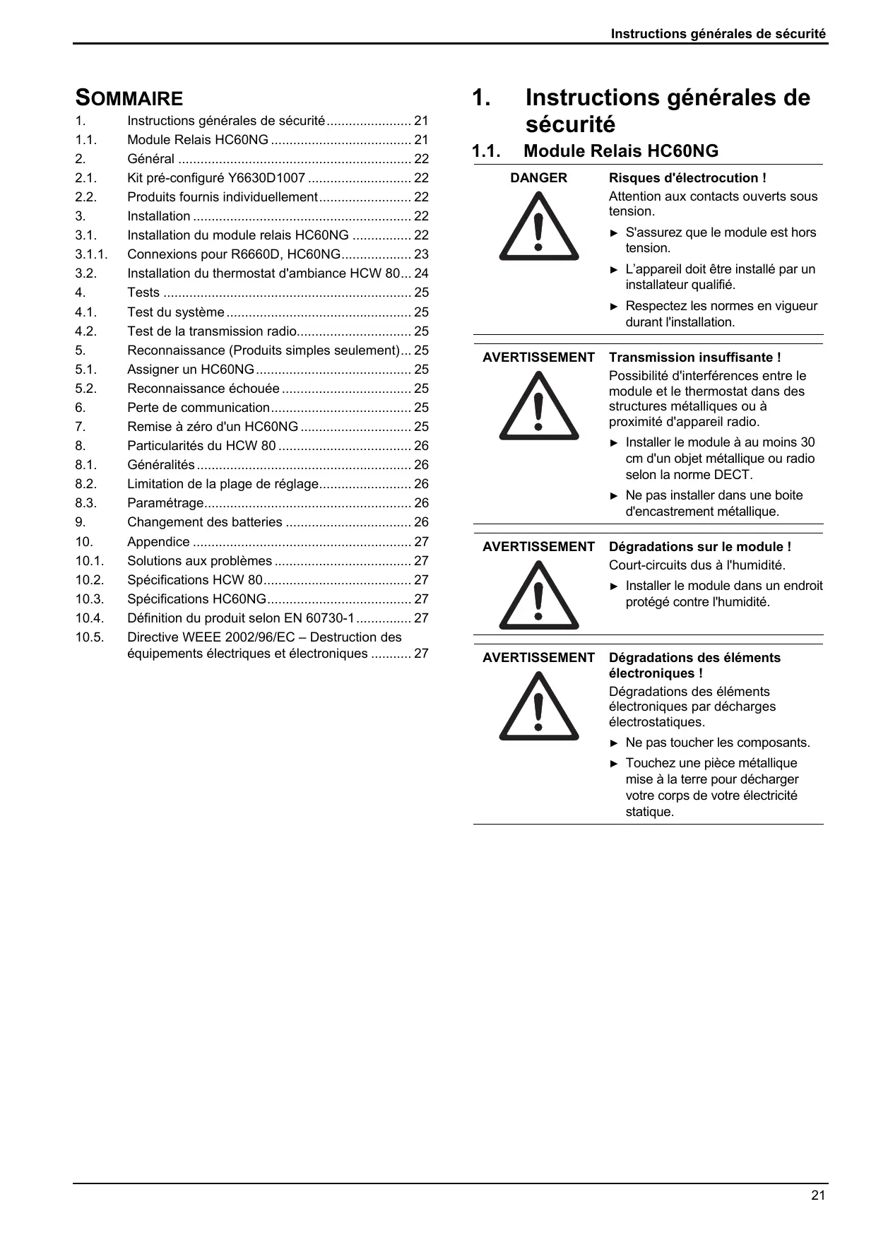 Instructions générales de sécurité 21 Module Relais HC60NG 21 Général 22 Kit pré-configuré Y6630D1007 22 Produits fournis individuellement 22 Installation 22 Installation du module relais HC60NG 22 Connexions pour R6660D, HC60NG 23 Installation du thermostat d'ambiance HCW 80... 24 Tests 25 Test du système 25 Test de la transmission radio 25 Reconnaissance (Produits simples seulement)... 25 Assigner un HC60NG 25 Reconnaissance échouée 25 Perte de communication 25 Remise à zéro d'un HC60NG 25 Particularités du HCW 80 26 Généralités 26 Limitation de la plage de réglage 26 Paramétrage 26 Changement des batteries 26 Appendice 27 Solutions aux problèmes 27 Spécifications HCW 80 27 Spécifications HC60NG 27 Définition du produit selon EN 60730-1 27 Directive WEEE 2002/96/EC – Destruction des équipements électriques et électroniques 27
