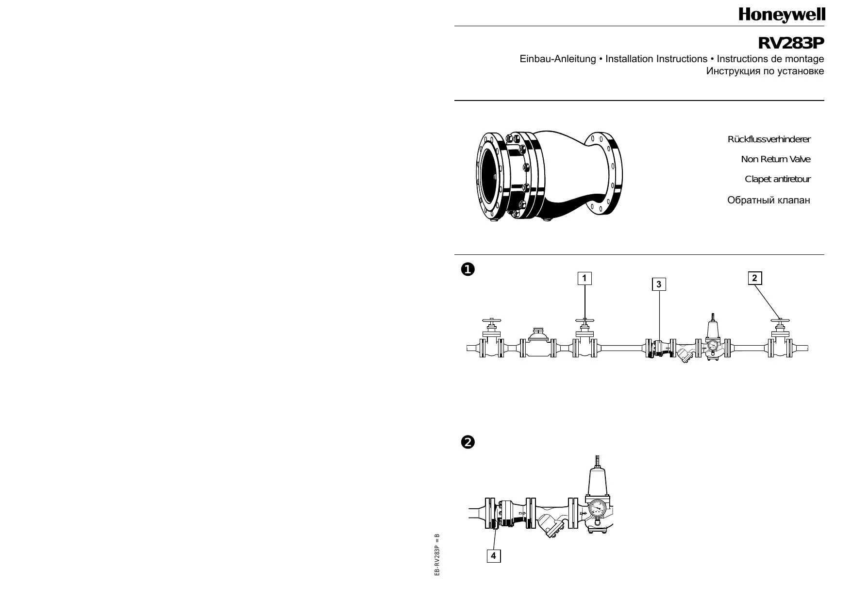 Lors du montage il faudra observer la réglementation locale ainsi que les directives générales et les instructions de montage. Le lieu d’installation sera à l’abri du gel et bien accessible. 1.1 Montage (Fig. 1) 1. Bien rincer la tuyauterie. 2. Fermer les vannes 1 et 2 . 3. Monter le clapet antiretour ● Position de montage dans un tuyau horizontal ou ascendant dans le sens du courant ● Robinet de contrôle 4 dirigé vers le bas 4. Ouvrir les vannes 1 et 2 .