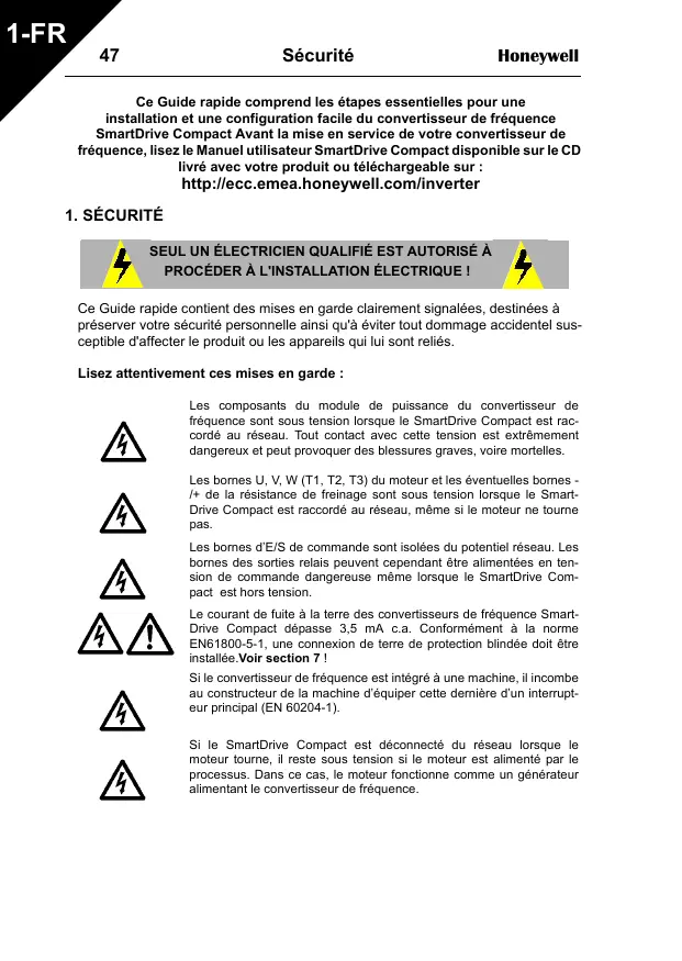 Conformé aux exigences de la catégorie C2 de la norme produit EN 61800-3 (Honeywell classe H: conforme aux exigences d'une installation normale en bâtiment).
