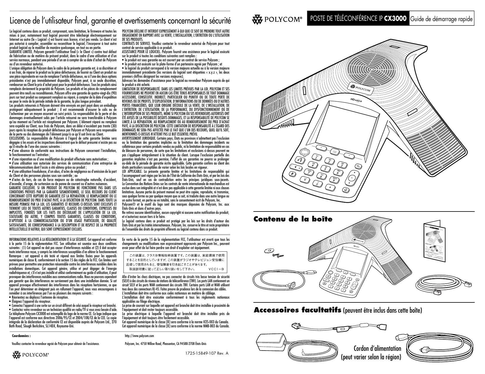 Adressé les demandes d'assistance pour le calculi au revendeur Polycom aprouc de qui le produit a eget acheté.
